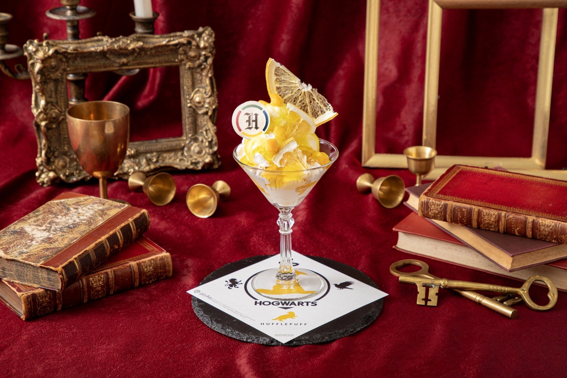 パンナコッタやバニラとヨーグルトの2種のアイスをのせ、ハッフルパフを象徴するカラーをイメージしたレモンソースで仕上げたパフェです。