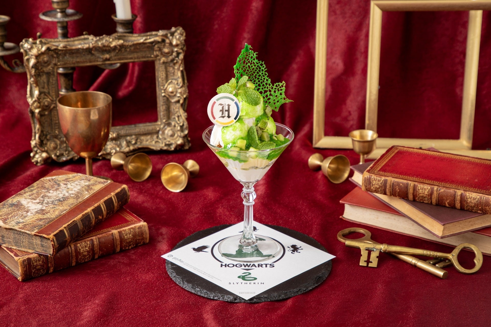 パンナコッタやバニラとヨーグルトの2種のアイスをのせ、スリザリンを象徴するカラーをイメージしたキウイソースで仕上げたパフェです。