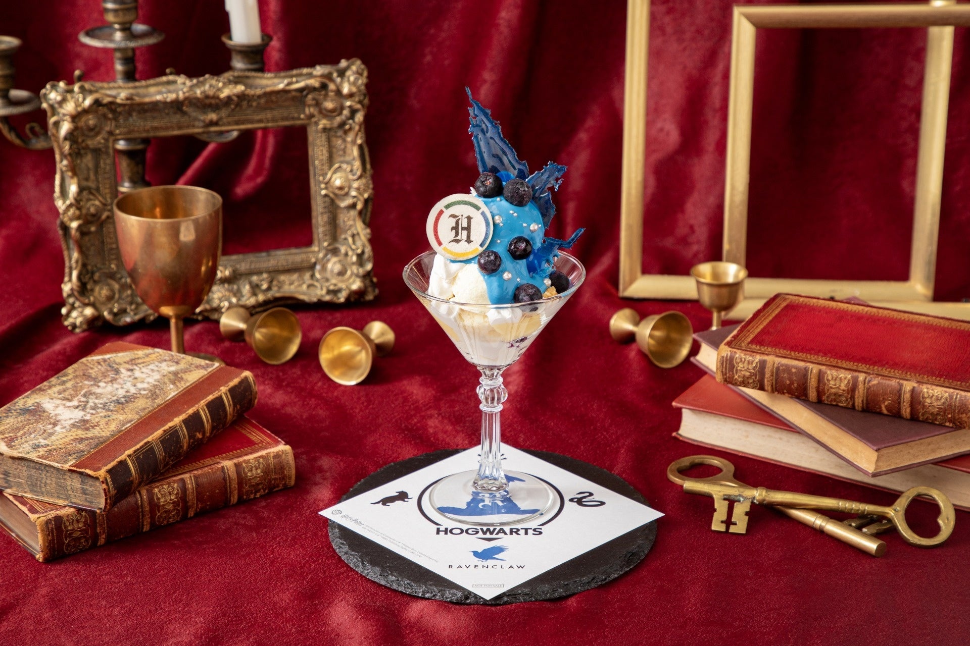 パンナコッタやバニラとヨーグルトの2種のアイスをのせ、レイブンクローを象徴するカラーをイメージしたブルーのヨーグルトクリームで仕上げたパフェです。