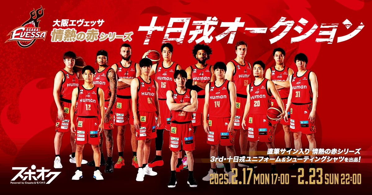 株式会社モバオク(本社:東京都渋谷区、代表取締役社長:生田目 知之、以下モバオク)がエンゲート株式会社(本社:東京都中央区、代表取締役:城⼾ 幸⼀郎、以下エンゲート)と業務提携し提供するスポーツチーム公式オークションサービス「スポオク」にて、B.LEAGUE所属の大阪エヴェッサが実施する『大阪エヴェッサ 「情熱の赤シリーズ」十日戎オークション』を2025年2月17日(月)から開始します。