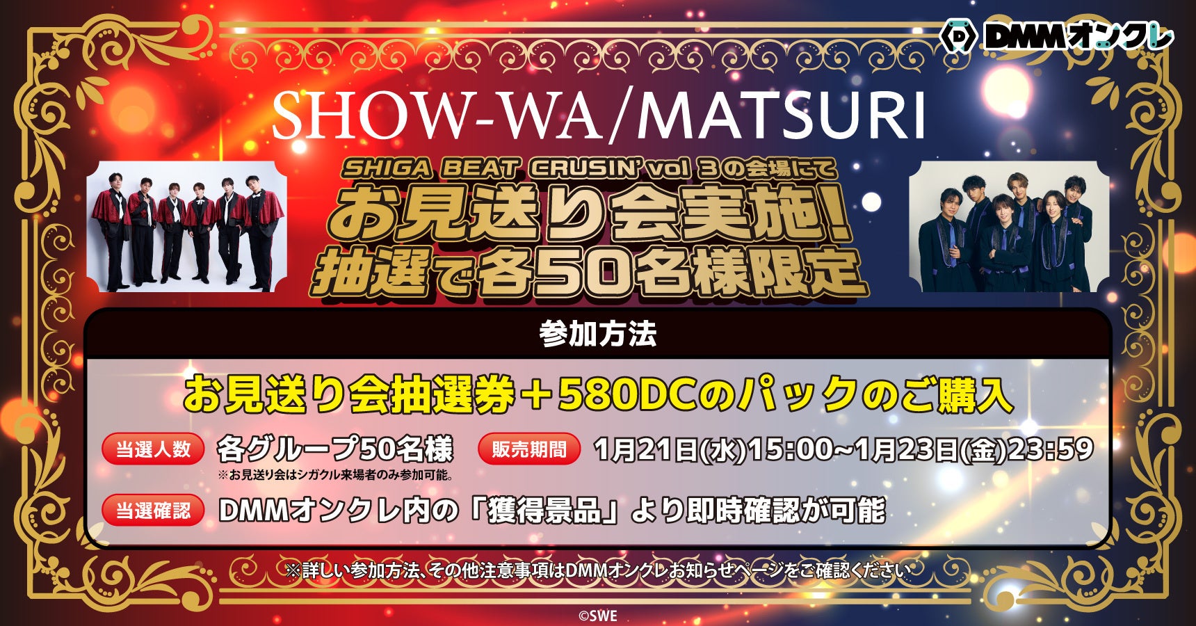 合同会社DMM.com(本社:東京都港区、PFカンパニーCEO:村中悠介、以下DMM)が提供するオンラインクレーンゲームサービス「DMMオンクレ」は2026年1月24日(土)開催『SHIGA BEAT CRUISIN’ Vol.3』出演アーティストのSHOW-WA・MATSURIのオリジナルグッズを、2026年1月23日(金)18:00より展開します。