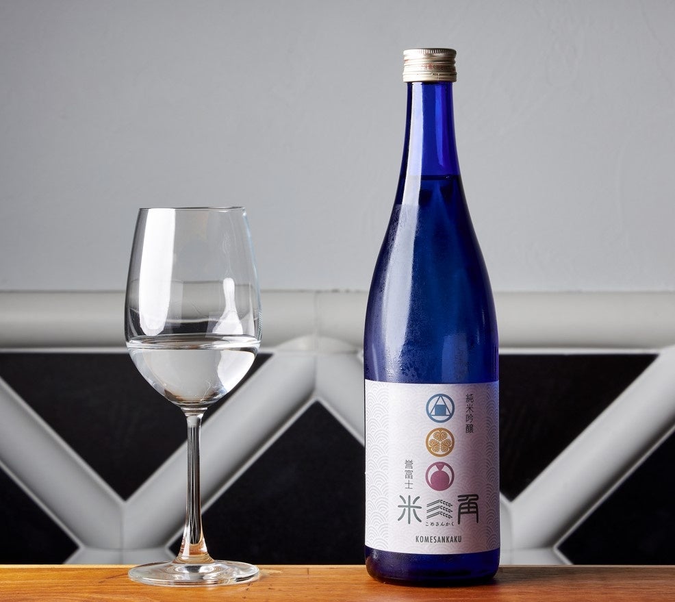 遠州山酒造へ海鮮・⼲物に合うお酒を依頼して醸造された、オリジナルSAKE「⽶三⾓純⽶吟醸〜誉富⼠〜」。