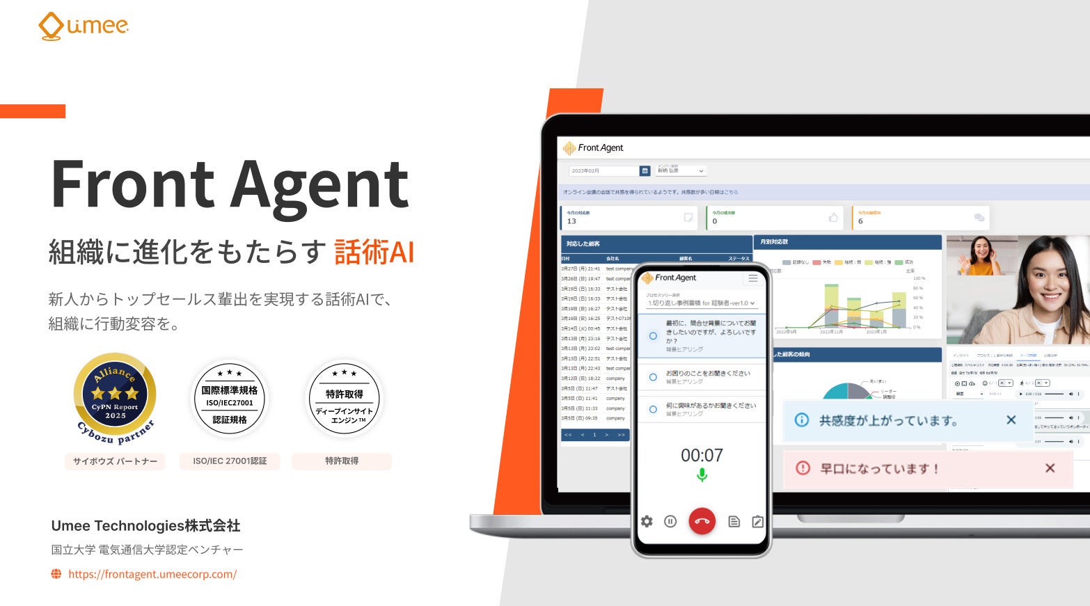ユミーは、対面、WEB会議、電話、あらゆる商談をリアルタイムで解析し、組織に進化をもたらす話術AI「Front Agent」の紹介をいたします。