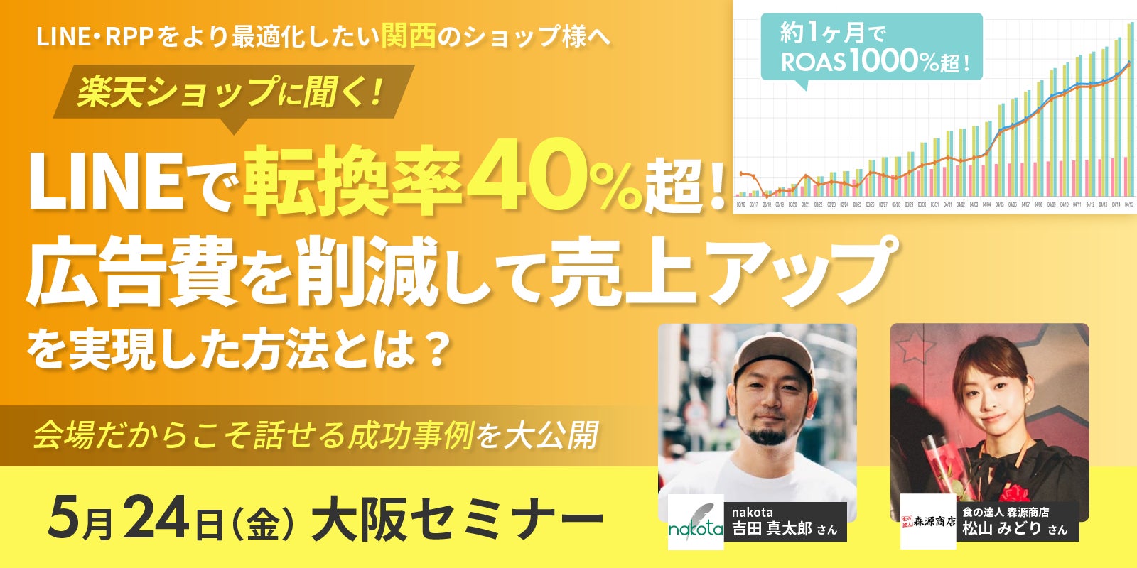 今回のセミナーでは、楽天ショップがLINEを活用し、広告費を削減して売上をアップする方法を解説します。今回は特別に、大阪で実際に楽天ショップを運営し、成功している2名のゲストスピーカーから、RPP(検索連動型広告)、LINE配信、レビュー対策など、それぞれのショップのこだわりと成功事例をお話しいただきます。
