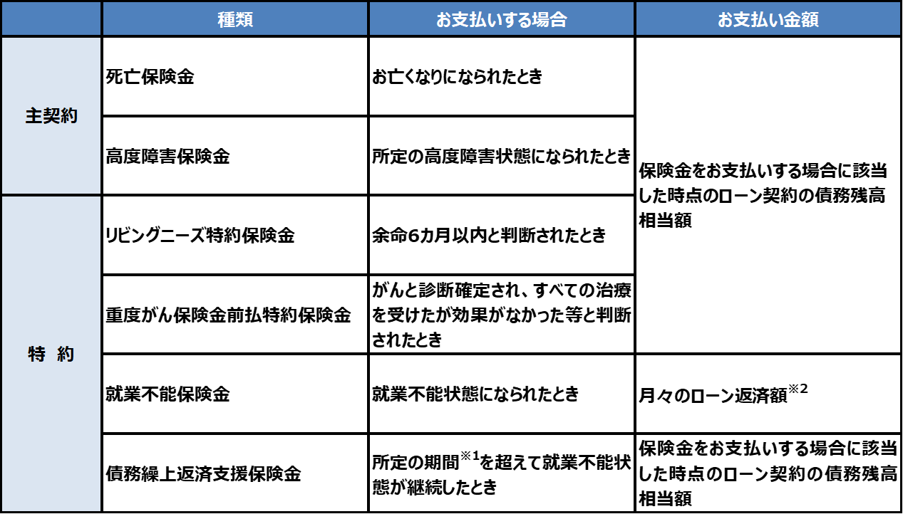 (2)病気やケガのリスクに備える「全疾病保障」※の就業不能保障特約において、就業不能状態が継続した場合には月々の返済額が就業不能状態の期間に応じて保障され、就業不能状態が一定期間継続した場合には残債が一括で保障されます。がん、急性心筋梗塞、脳卒中など8大疾病の場合はもちろんのこと、それ以外の疾病やケガにつきましても、手厚い保障が提供されます。