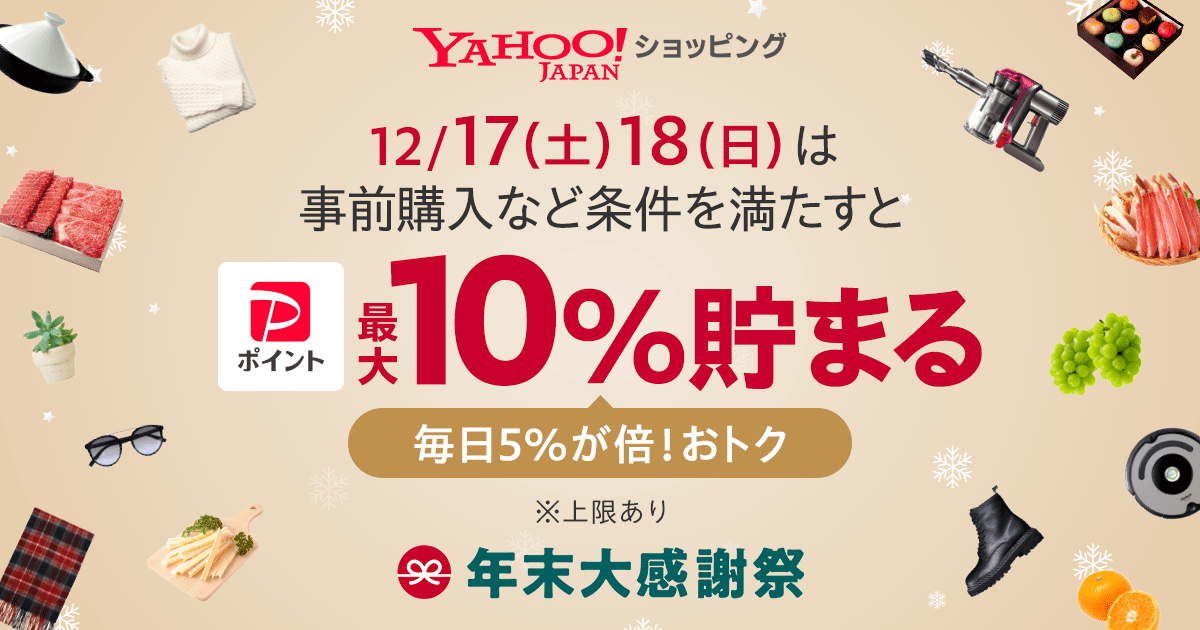 ヤフー株式会社(以下、Yahoo! JAPAN)が運営する毎日おトクな「Yahoo!ショッピング」は、2022年12月3日(土)0時00分から19日(月)01時59分(※1)まで、「年末大感謝祭」(以下、本キャンペーン)を開催します。事前購入などの条件を満たすと最大10%のPayPayポイントが貯まる年内最後のビックイベントです。