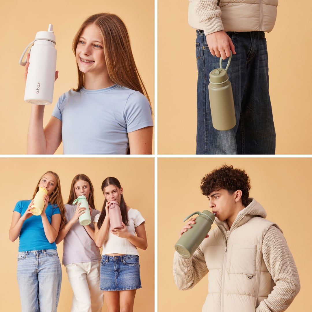 b.boxの「フリップトップボトル」は、小学生以上の大きなお子様から大人まで幅広く使える大容量ステンレスボトルです。1Lと690mlの2サイズを展開し、日常の水分補給をスマートにサポートします。