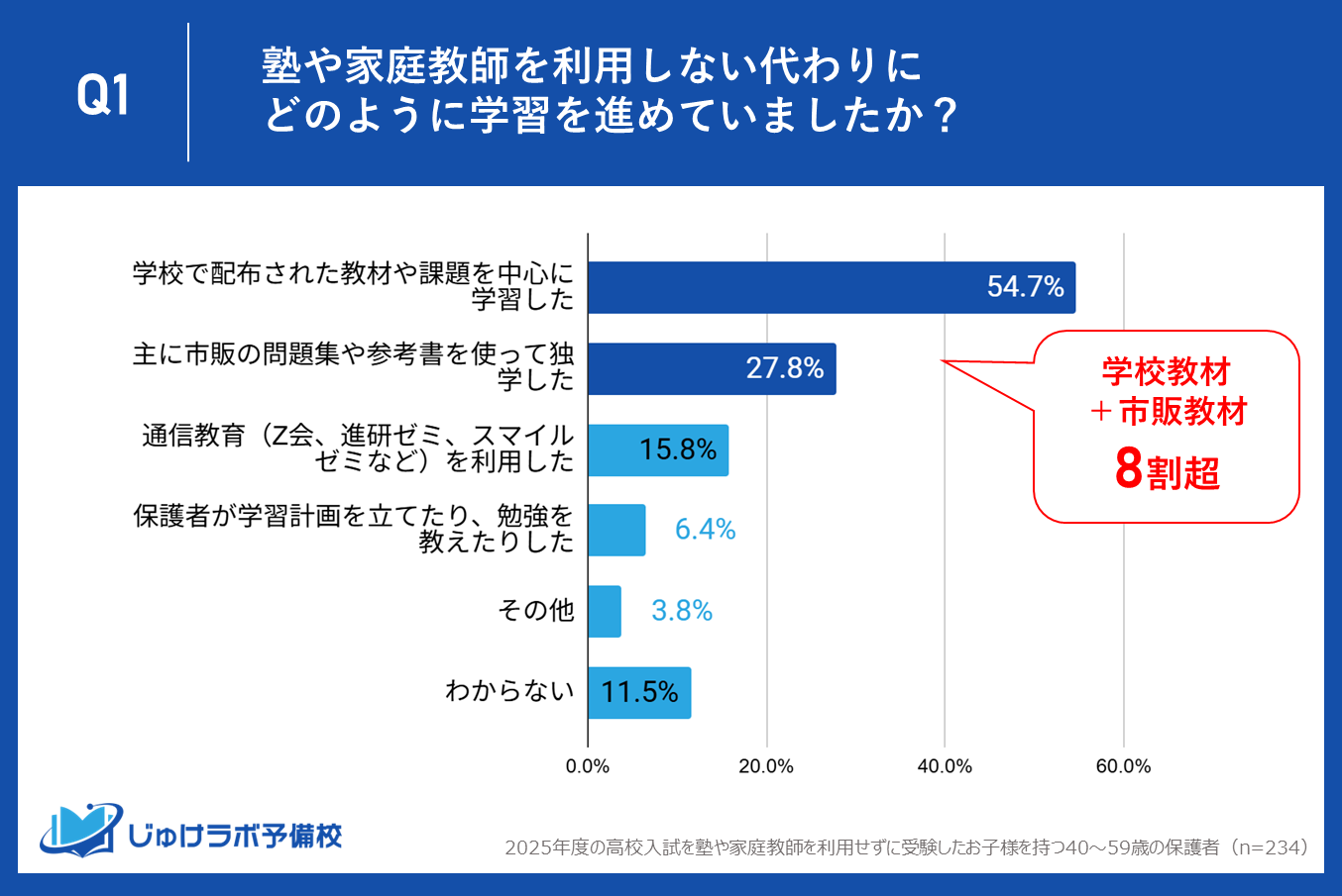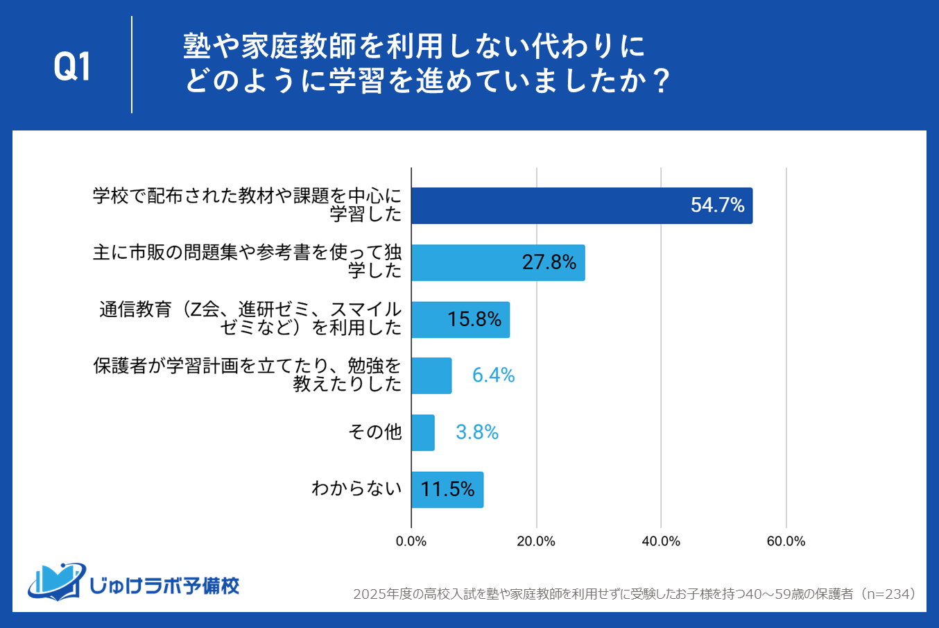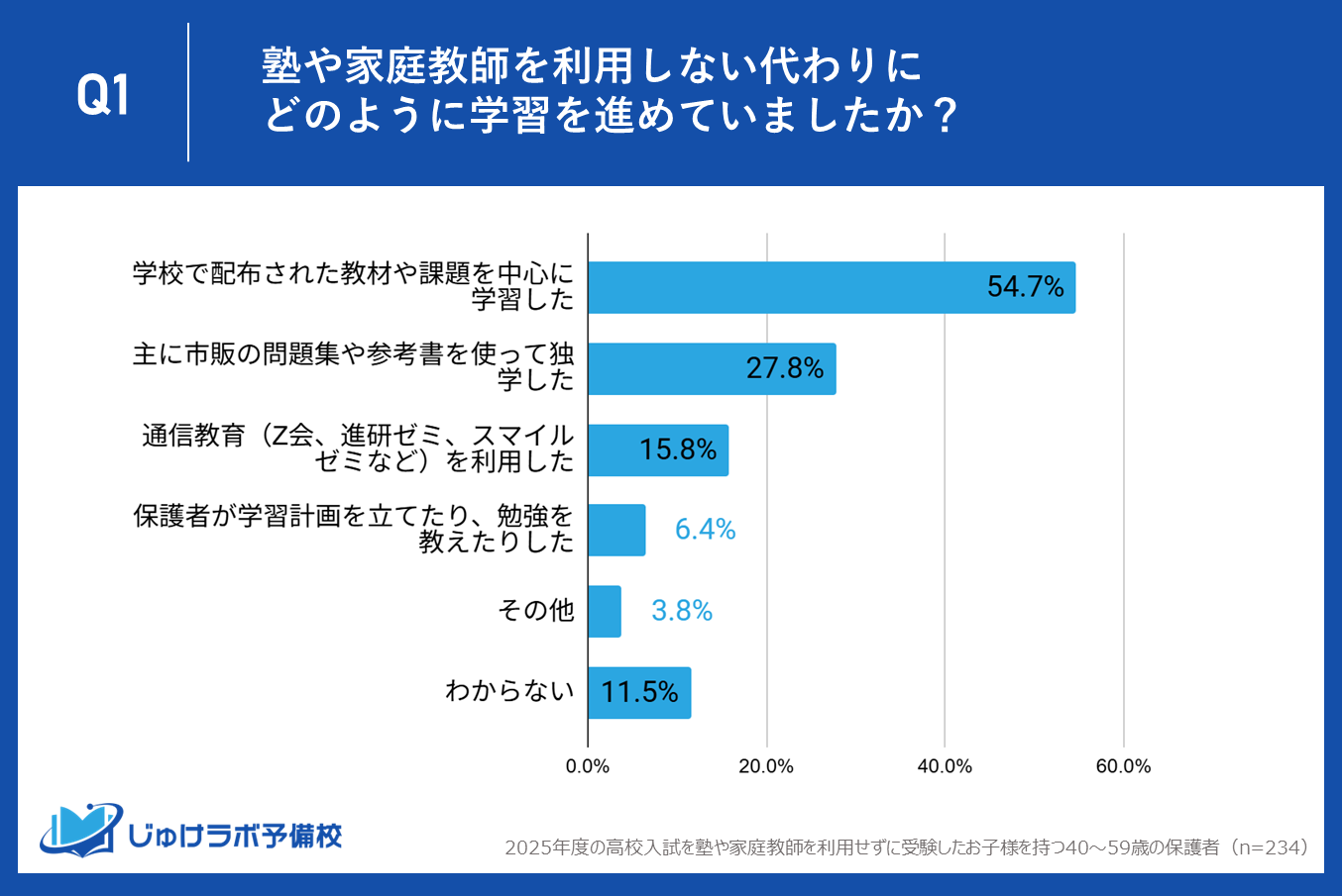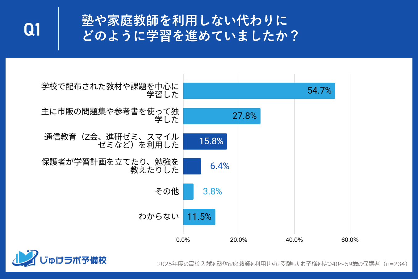 じゅけラボ予備校は、2025年度の高校入試を塾や家庭教師を利用せずに受験したお子様を持つ40~59歳の保護者234名を対象に、「塾なしでの学習方法」に関するアンケート調査を実施しました。