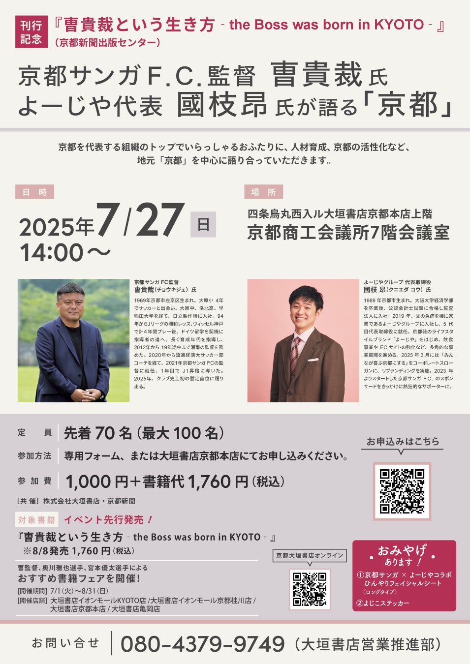 【7/27開催】『曺貴裁という生き方』出版記念(先行販売)トークイベント 京都サンガF.C.監督 曺貴裁氏×よーじや代表 國枝昂氏が語る「京都」