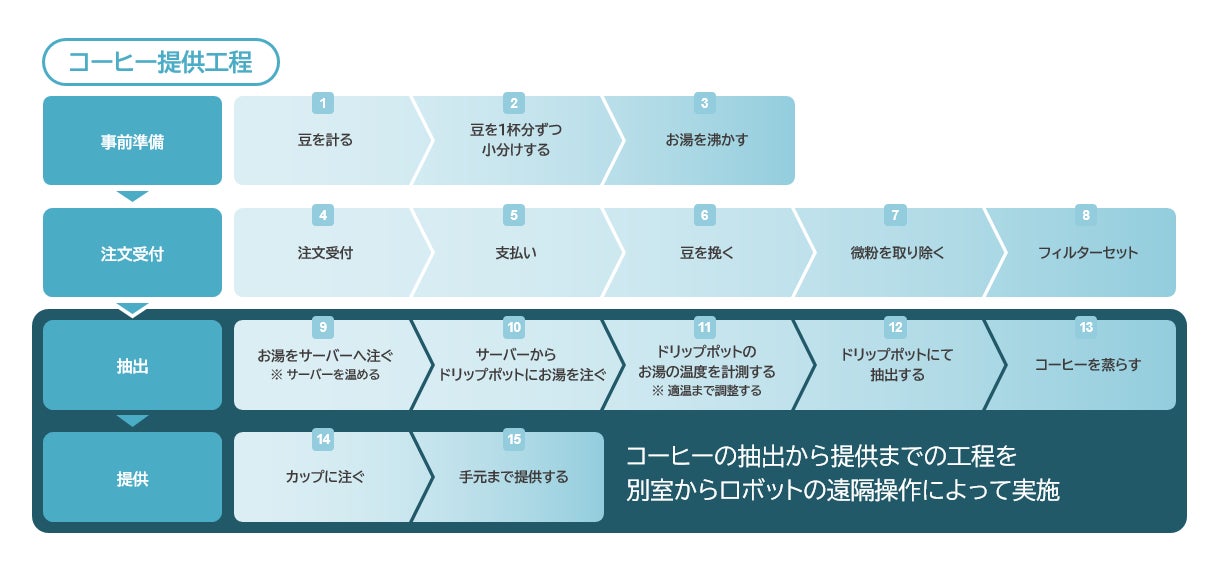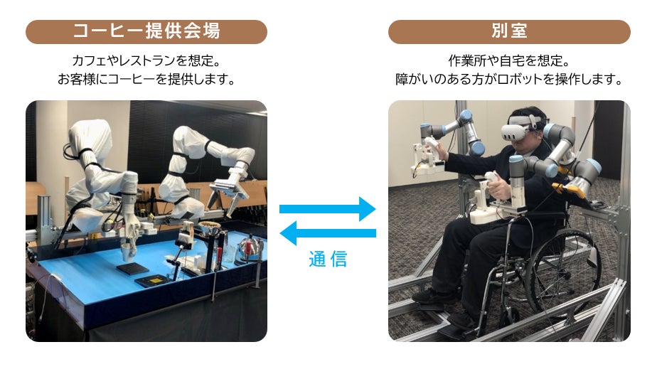 本イベントは、ベルシステム24の障がい者スタッフが、コーヒー提供会場とは異なる部屋からロボットを遠隔操作して、コーヒーの抽出から提供の工程までを実施します。本取り組みにより、「リアルハプティクス®」を搭載したロボットを用いることで、複雑な作業も特殊な訓練を必要とせずに遠隔化できることを確認し、味わいや提供スピードも問題なくコーヒーの提供が可能かを検証します。