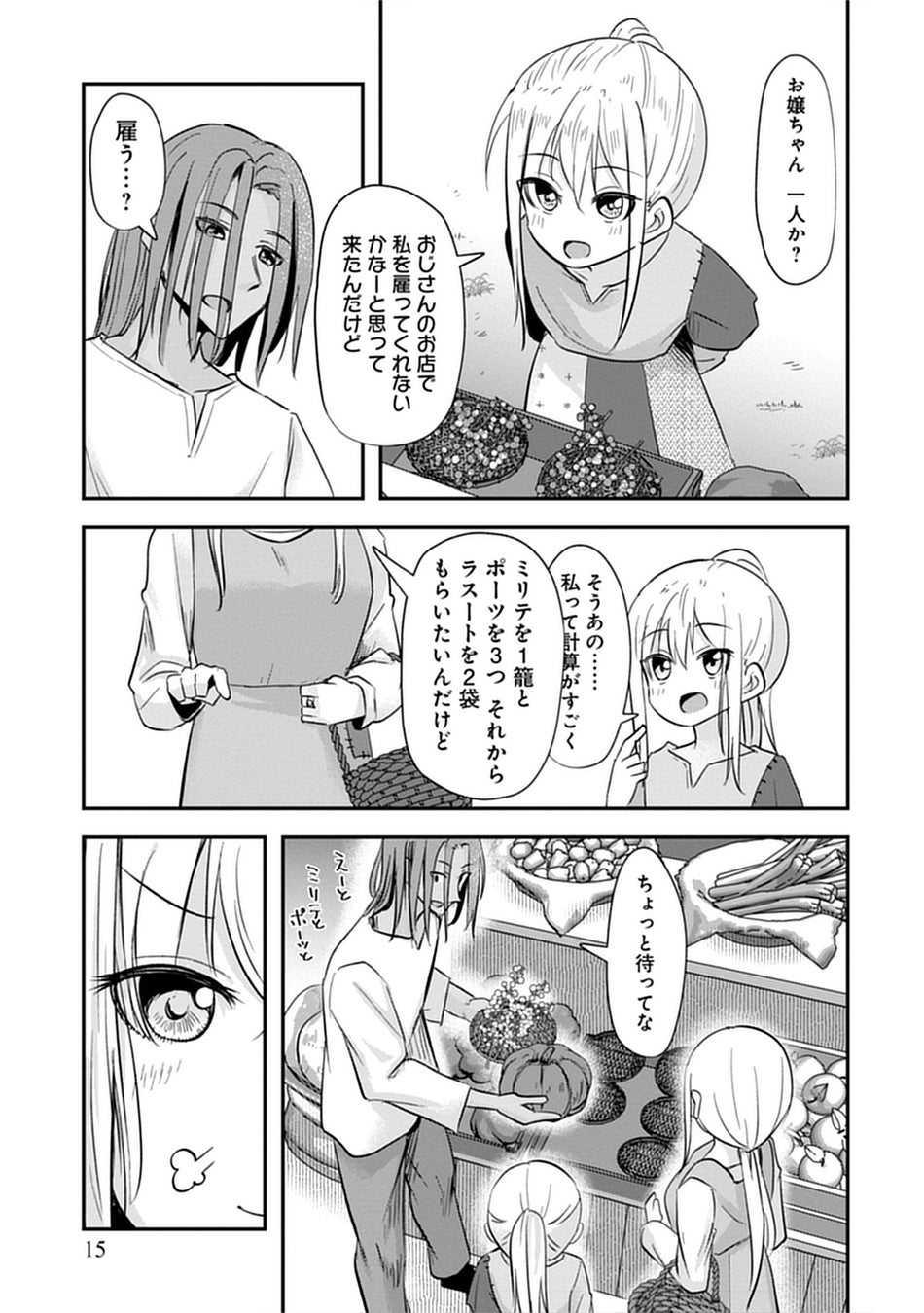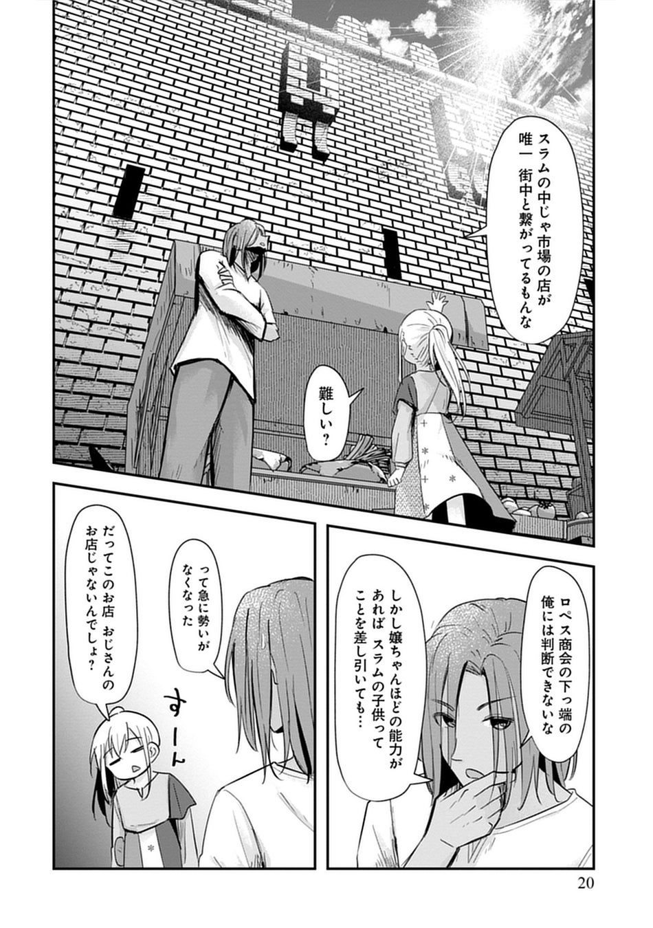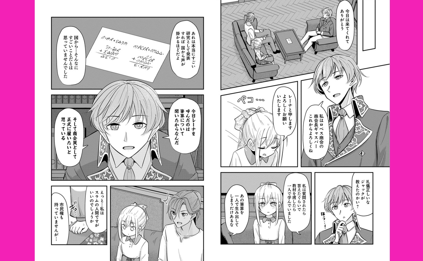 スラム街で家族と暮らしていたレーナは、ふいに日本で生きた記憶を思い出す。その後…快適だった日々と今を比べ、現状に耐えられなくなってしまう。豊かな生活を目指したレーナは、街の住人が運営する市場で特技の暗算を披露!! そして…街の中で雇ってもらえるように交渉をして――。