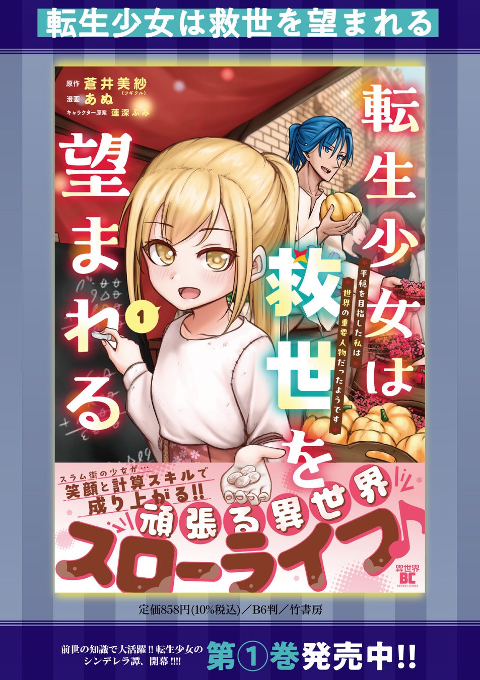 スラム街の少女が…笑顔と計算スキルで成り上がる!! 頑張る異世界スローライフ!!『転生少女は救世を望まれる 平穏を目指した私は世界の重要人物だったようです』第1巻 3月6日(木)発売!