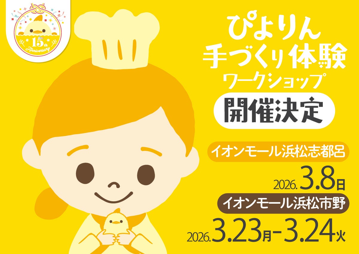 ジェイアール東海フードサービス株式会社(本社:愛知県名古屋市、代表取締役社長:岩下賢一)が展開するオリジナルスイーツ「ぴよりん」の手づくり体験ができるワークショップを、2026年3月8日(日)に「イオンモール浜松志都呂」、3月23日(月)・24日(火)に「イオンモール浜松市野」にて開催いたします。本イベントでは、ぴよりんの製造工程の一部を体験しながら、自分だけのぴよりんを手づくりで仕上げていただけます。完成後は、その場でできたてをお召し上がりいただけます。普段はなかなか見ることのできない“ものづくりの楽しさ”を体感できる、体験型ワークショップです。