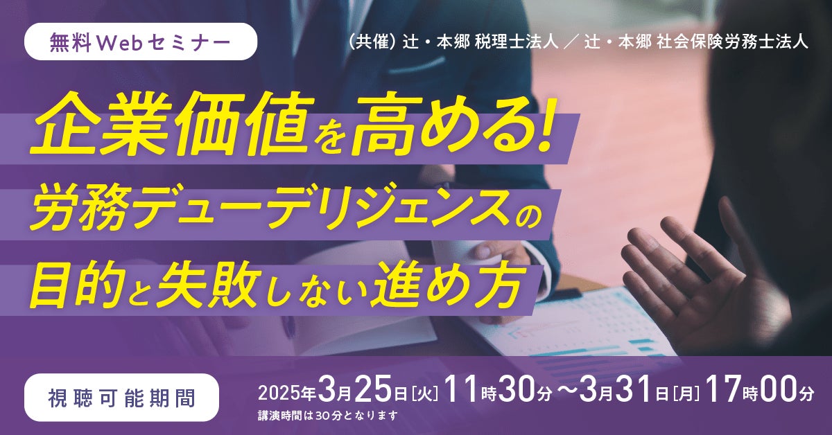 辻・本郷 税理士法人(本社:東京都新宿区、理事長:桑木小恵子)は、辻・本郷 社会保険労務士法人(本社:東京都新宿区、代表社員:髙橋紀行)の2社共催で、2025年3月25日(火)より「企業価値を高める!労務デューデリジェンスの目的と失敗しない進め方」セミナーを開催いたします。近年、財務面だけでなく労務面のリスクについても注目する企業は多く、M&AやIPOを検討する企業はもちろん、働きやすい職場環境づくりのために労務デューデリジェンスを実施する企業も増えています。本セミナーでは労務デューデリジェンスの基本から具体的な注意点まで社会保険労務士が解説します。