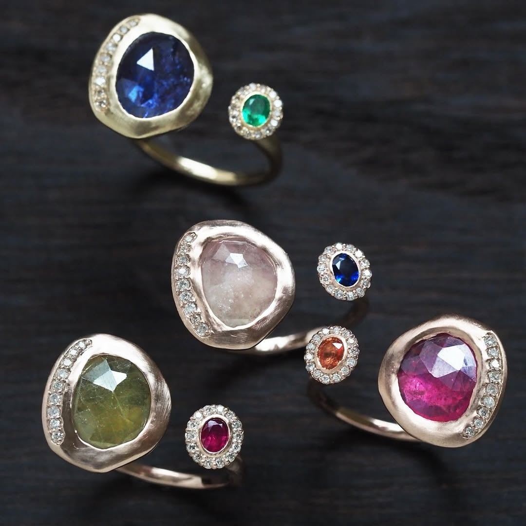 「ポンポネ」はパーセル ジュエリーを代表するシリーズ、ブーケのようなリングです。クラシックな中石の取り巻きと槌目入りのアームが印象的で、洗練された華やかさを備えています。「ポンポネモザイク」など、ストーンの組み合わせに個性が光るバリエーションも豊富です。