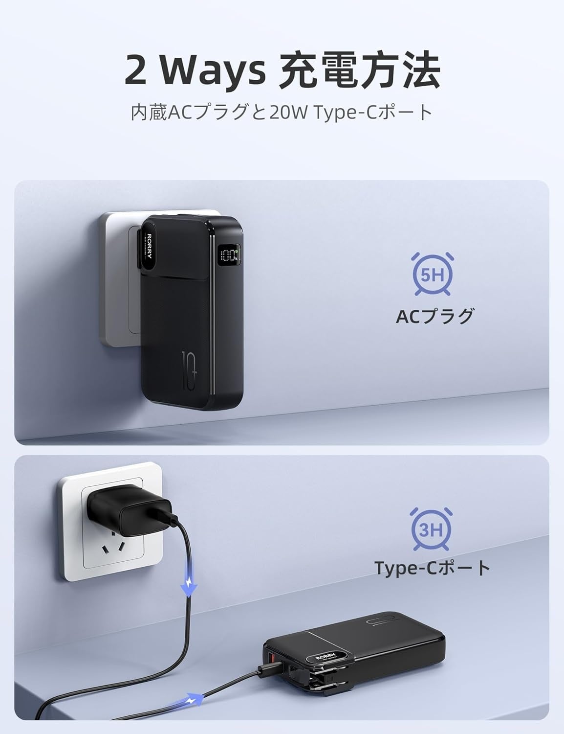 3、RORRY 4in1 10000mAhコンセント付きモバイルバッテリー
