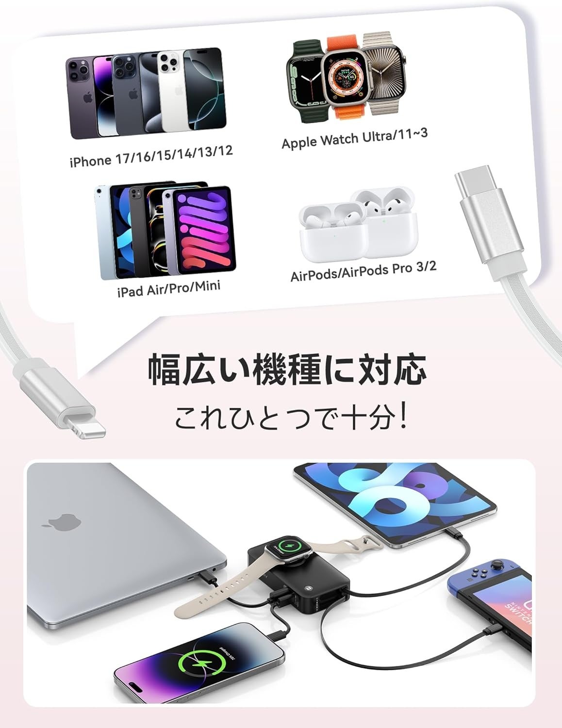 複数の充電器やケーブルを用意する必要がなく、充電の手間と時間を大幅に節約できるのが特徴です。寝ている間に両方満充電できる。さらに、LightningとType-Cの内蔵ケーブルに加え、USB-C(30W)ポート・USB-A(15W)ポート・Apple Watchワイヤレス充電を搭載し、最大5台のデバイスを同時充電できます。