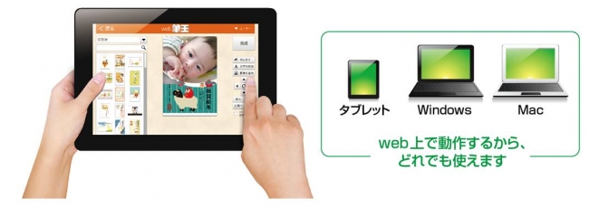 ■タブレットでも、Macでも作れる新サービス、「web筆王」が使える本製品を購入いただくと、Mac やタブレットでも利用可能な「web 筆王」が使えます。機能は簡略ですが、これまで「筆王」が使えなかったタブレットやMac でも使えます。インストール無しですぐに使え、インターネットに接続すれば自宅だけでなく外出先や移動中でも使えます。