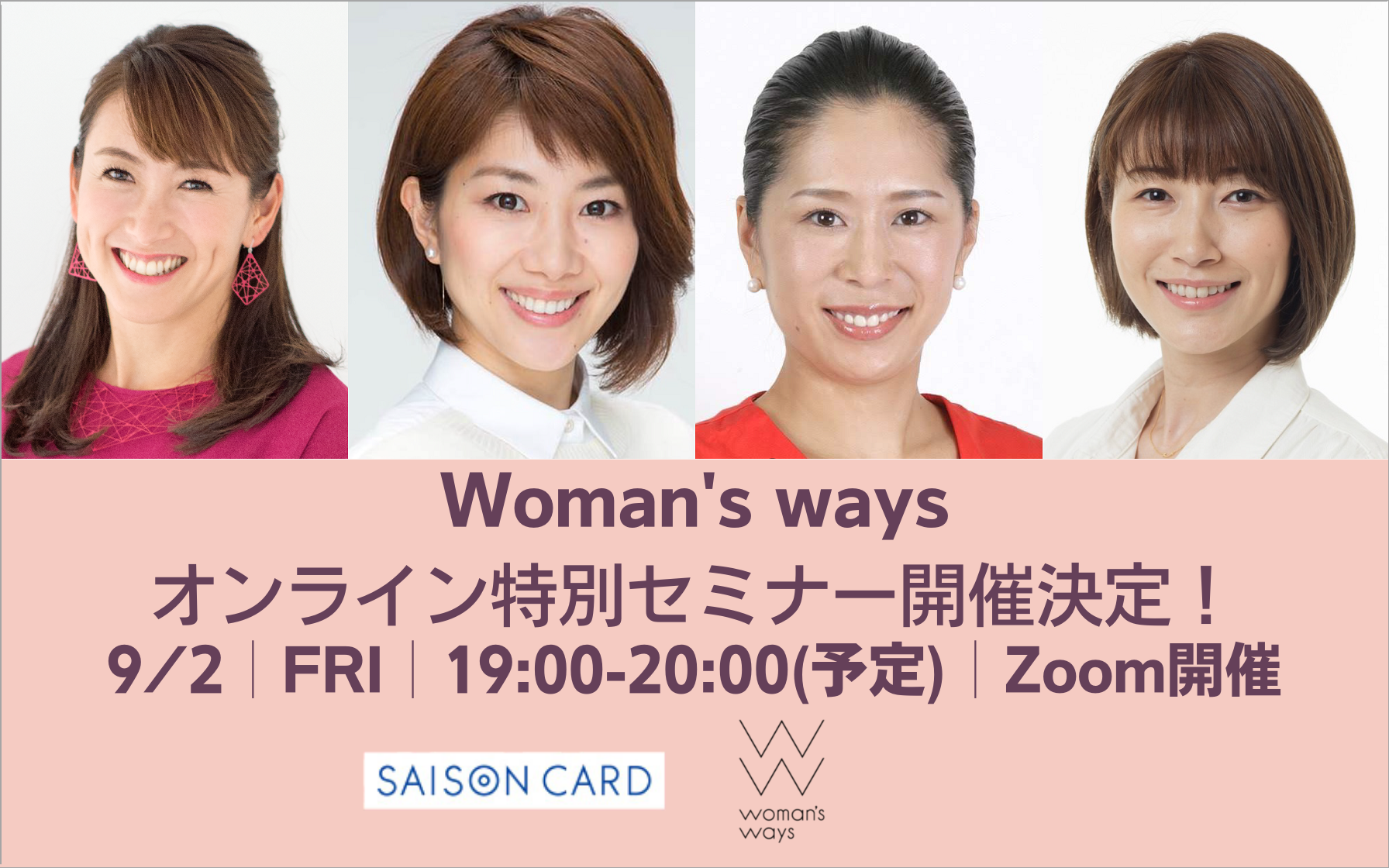一般社団法人Woman’s waysから、元アスリートの潮田玲子さん、中川真依さん、杉山愛さん、狩野舞子さんをお招きし、「自身の身体との向き合い方と知識、日々の生活や働くうえでのより良いパフォーマンス」をテーマにお話しいただきます。オンライン(Zoom)でご参加いただける無料セミナー(先着500名様)となりますので、ぜひご参加ください。