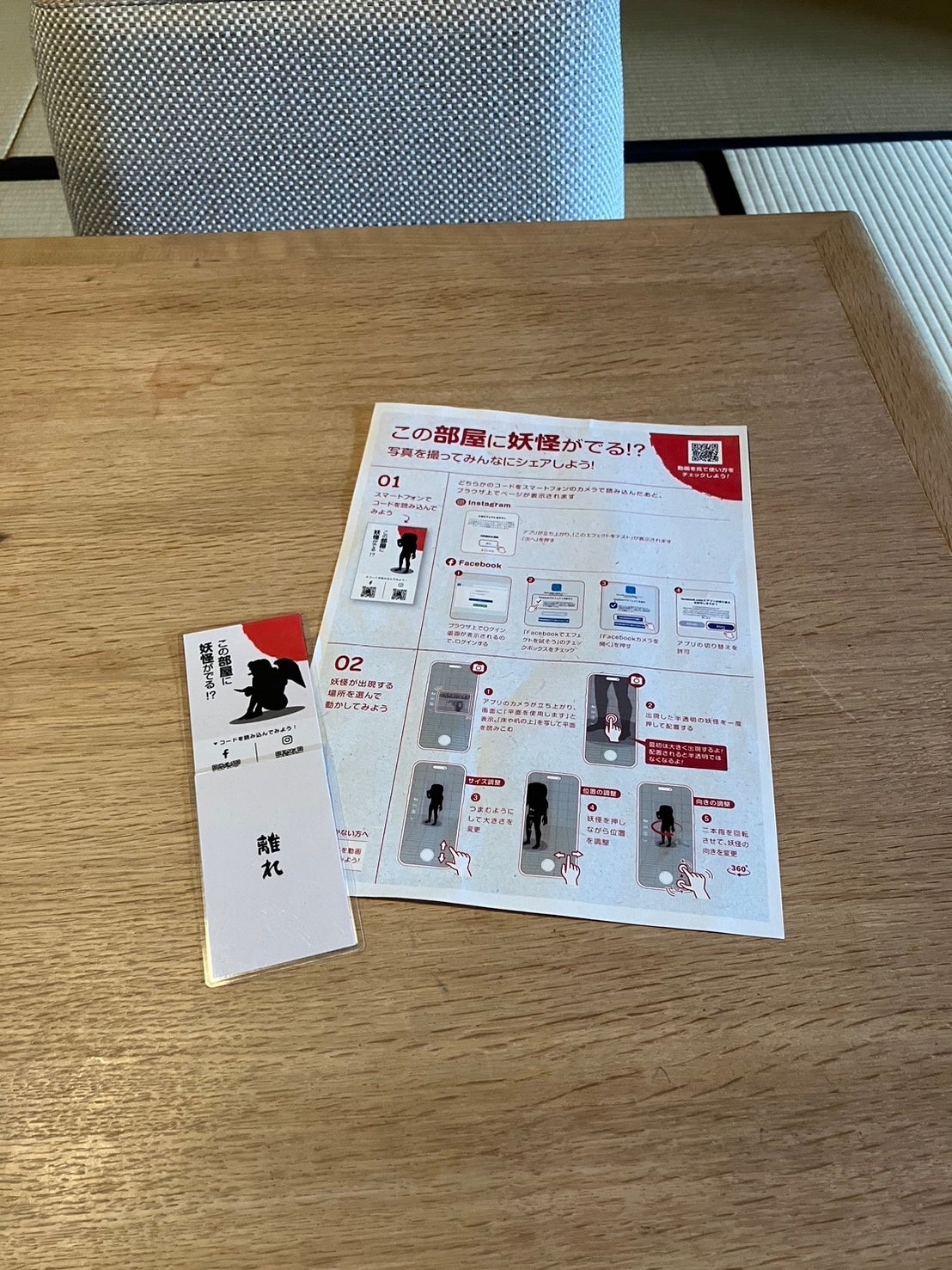 ARは、宿泊する部屋に置いてある専用のコード付きカードをスマートフォンで読み込むと、妖怪が登場する仕組みです。一緒に写真を撮り、SNSに投稿して共有することもできます。妖怪は天狗(=写真)のほか計3種類あり、4か月ごとに入れ替わる予定です。天狗以外にどのような妖怪が登場するかは、宿泊時のお楽しみに。