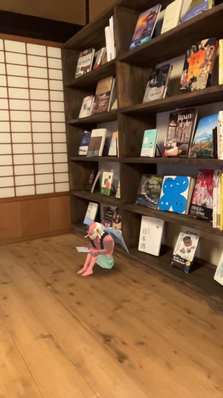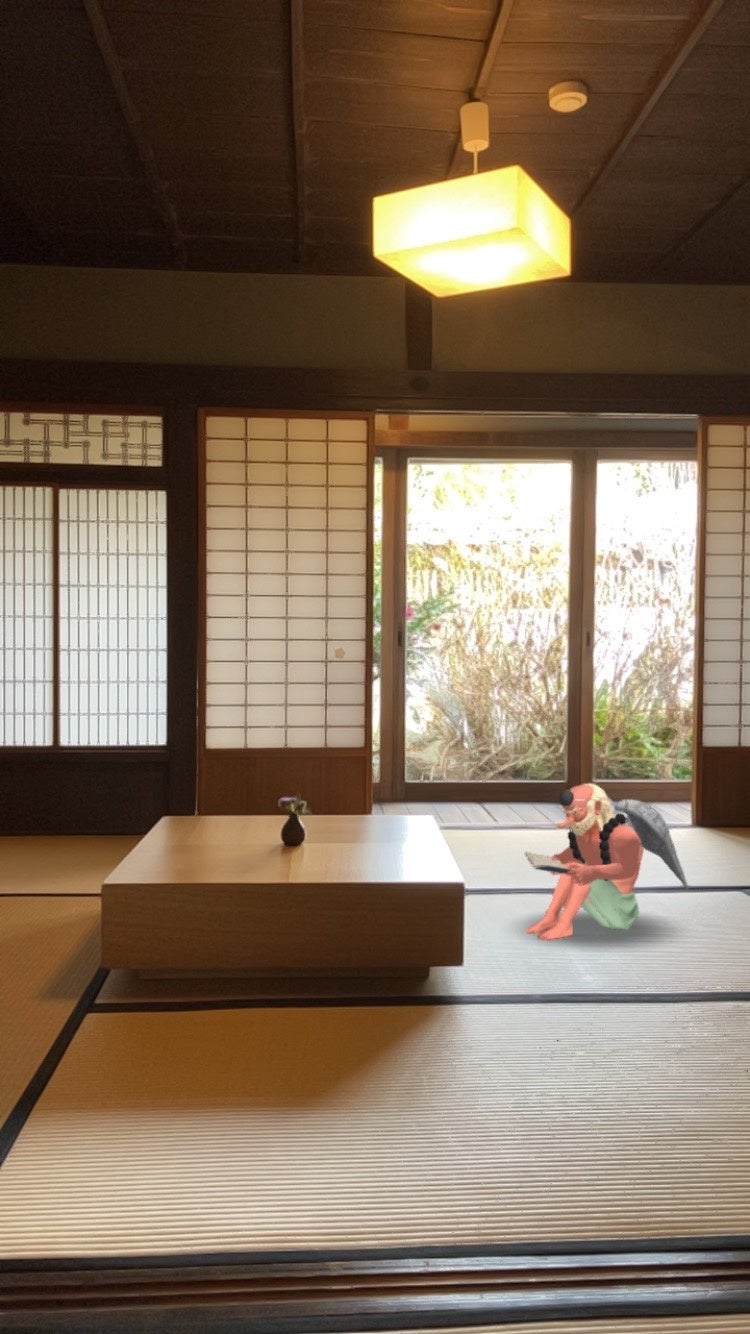 こちらのARでは、柳田國男の著書に登場し、福崎町の人気観光コンテンツでもある妖怪が、「この部屋が当時どのように使われていたか」をテーマに動く様子を見て楽しめます。例えば、柳⽥國男が2階部分に置いてあった蔵書を読みふけったとされる「離れ」では、読書をする妖怪が登場します。「三⽊家住宅」には「離れ」のほかに「副屋」、「内蔵」、「⾓蔵」、「⽶蔵」と名付けられた計5つの部屋があり、また「旧辻川郵便局」エリアには、「〒201」と「〒202」という2つの部屋があります。