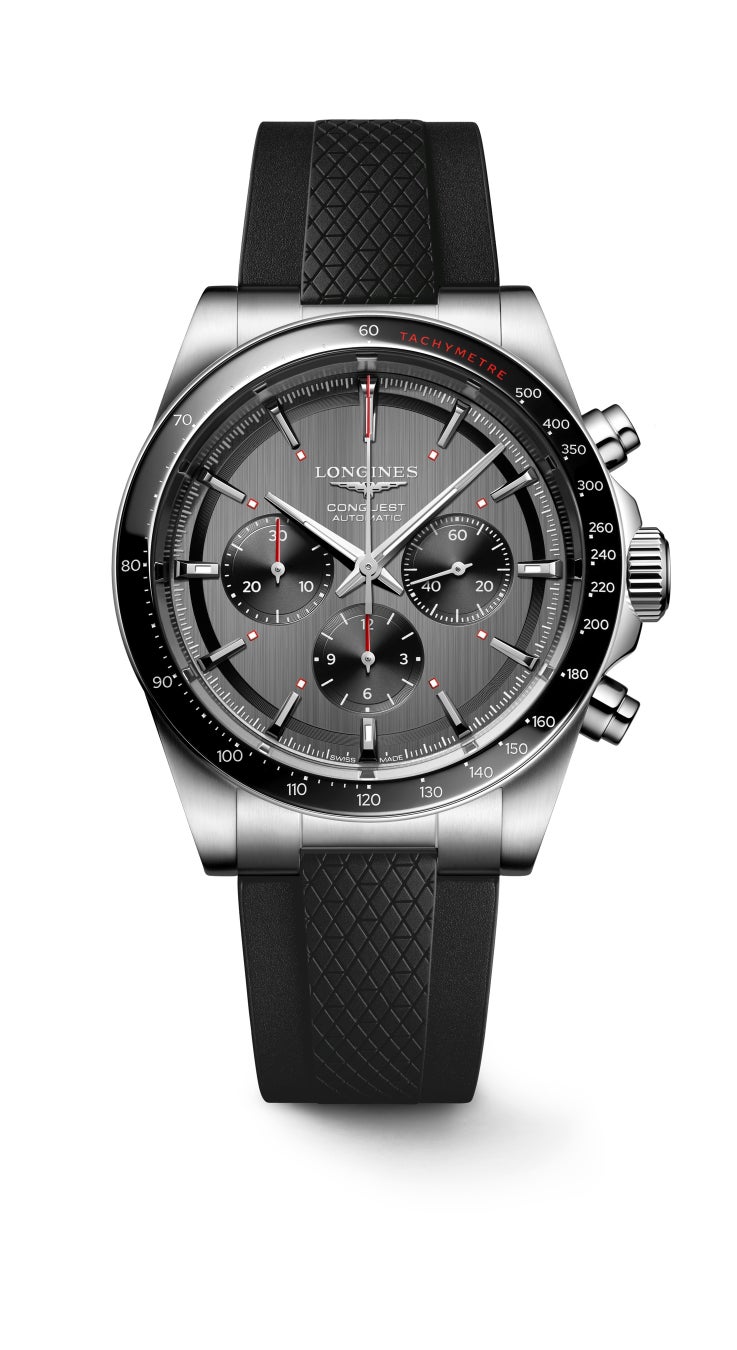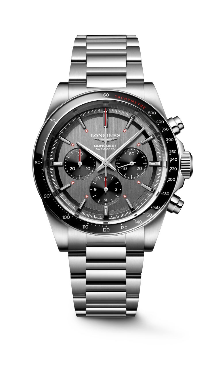「コンクエスト クロノ スキー エディション」の42mmのステンレススティール製ケースは、ポリッシュ仕上げとサテン仕上げが交互に施されています。ブラックセラミックのインサートとタキメーターベゼルを備えたこのクロノグラフは、10気圧防水。風防には、多層無反射処理を両面に施したサファイアクリスタルを採用。3時位置のブラックのスモールセコンド、6時と9時位置のブラックのカウンターのコントラストがきいたアンスラサイトカラーのダイアルが特徴です。ダイアルには、コレクションの象徴的なデザインであるスネイル仕上げが施されています。3時、6時、9時、12時位置のアプライド・インデックス、ポリッシュ仕上げを施したロジウムカラーの時針と分針には、スーパールミノバ®が塗布されています。中央のクロノグラフ秒針の先端と、12時間積算計および30分積算計の針は、セラミック製ベゼルのタキメータースケールの一部と同じレッドカラーで、視認性を高めています。
