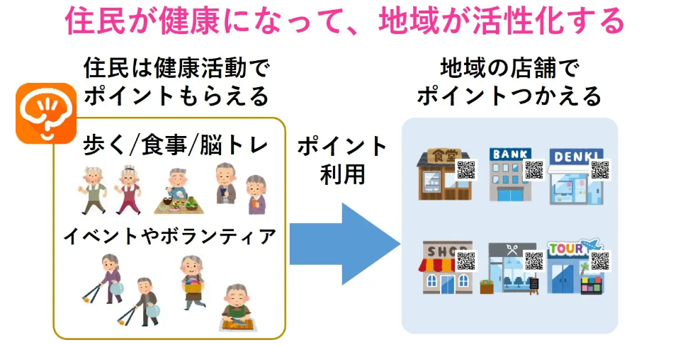 本サービスは、運動、食事、脳トレに加え、ボランティアや地域イベント参加などの社会参加も健康行動として後押しし、日々の取り組みに応じてポイントを付与する仕組みを備えています。獲得したポイントを地域内の店舗等で活用できるため、健康行動の促進と地域経済の活性化を同時に支援できる点が特長です。また、紙や台帳で運用されがちな健康ポイント事業のデジタル化にも対応し、住民の継続利用を支えるとともに、自治体職員の事務負担軽減や業務効率化にも寄与します。