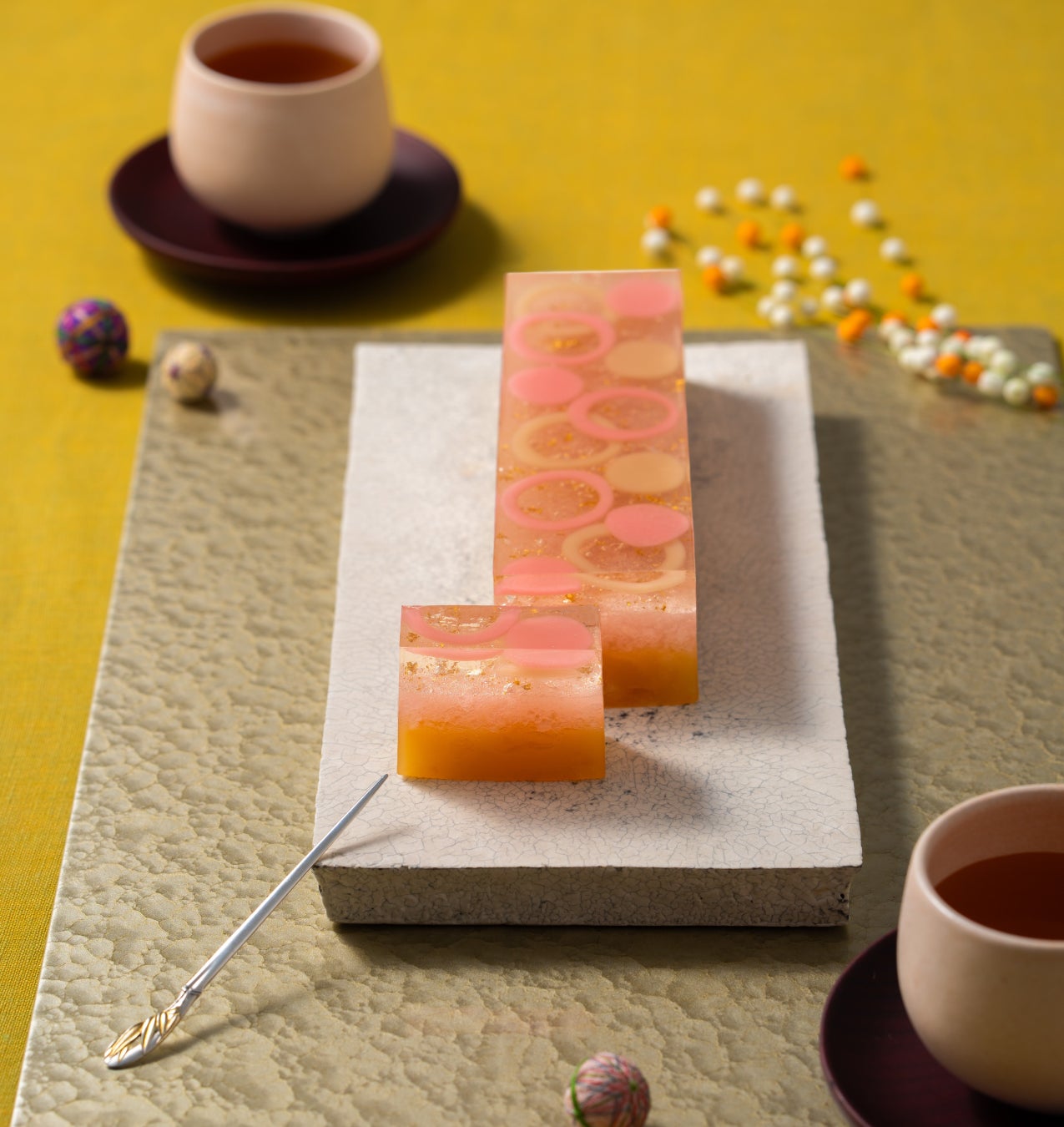 朋友は3層でできており、見た目の華やかさに加え、金柑のさわやかさともちもち食感を楽しめます。鼓月の京菓子づくりの技と、おいしさへのこだわりを詰め込んだ一品に仕上げました。
