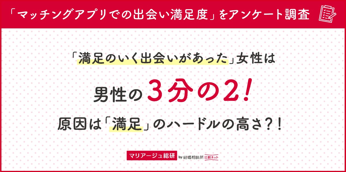 そこで今リリースでは反対に、「マッチングアプリで満足のいく出会いはあったのか」について調査を実施いたしました。男女の傾向の違い等に関する分析のほか、「結婚相談所比較ネット」アドバイザーによる、婚活・恋活サービスを通して満足する出会いに巡り合いやすくするコツも併せてご紹介いたします。