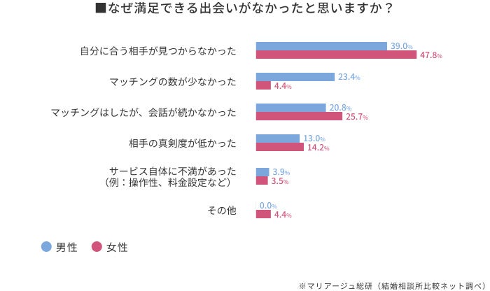 女性の場合、男性に比べて「マッチングはしたが会話が続かなかった」の回答が5%程多い結果となりました。これは女性が男性よりも、出会いの満足地点が「継続的な関係」になることであることが起因していると考えられます。