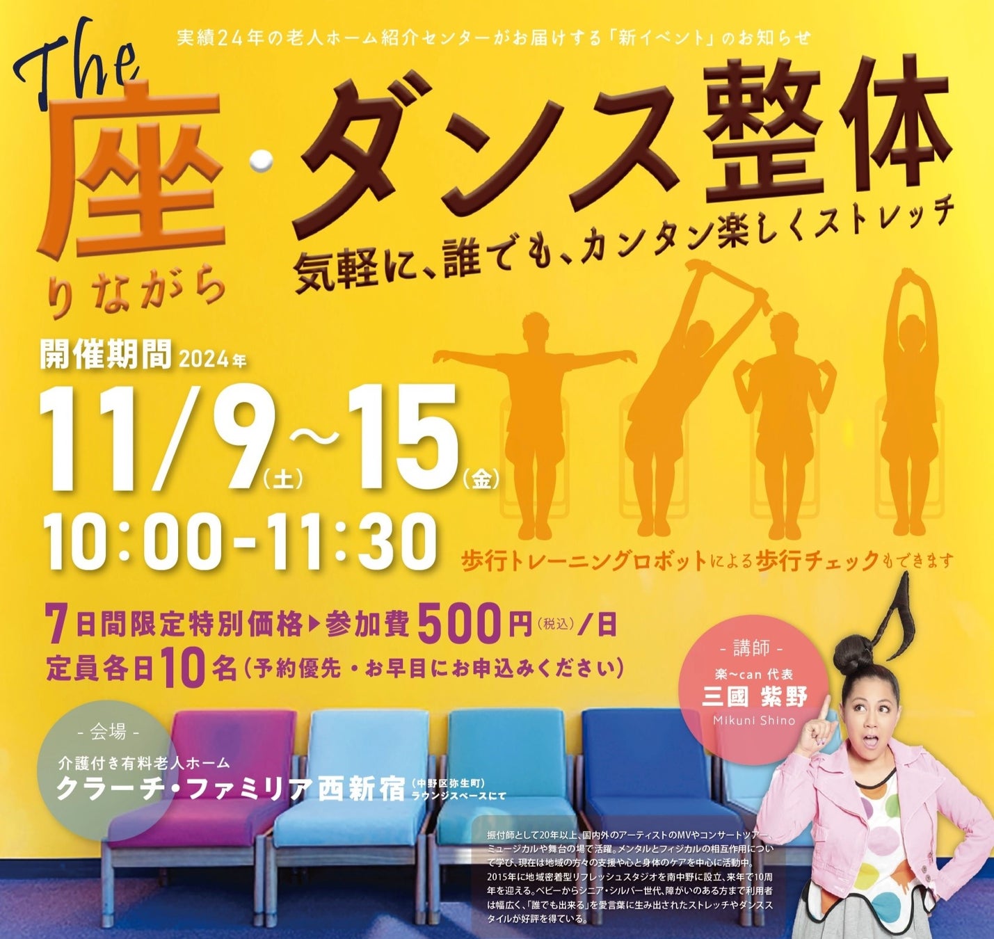 シニアライフのトータルサポート事業を展開する株式会社あいらいふ(本社:東京都新宿区、代表取締役:藤⽥敦史、以下、「あいらいふ」)は、2024年11月9日(土)〜15日 (金)、クラーチ・ファミリア西新宿(東京都中野区)において、「座・ダンス整体」(イベント詳細:https://i-life.net/latestposts/event20241007/)を開催いたします。