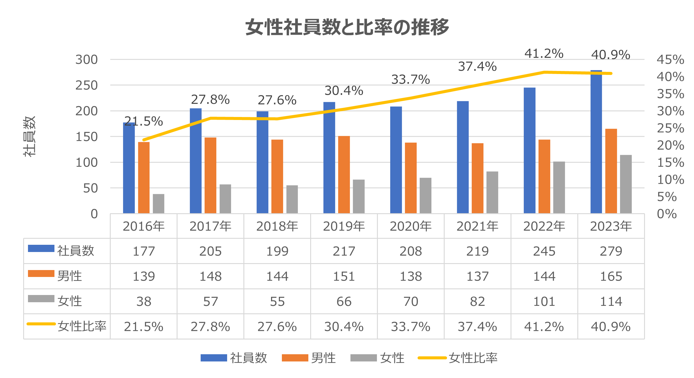 は、女性が活躍できる社会の実現を目指し、2016年度から2023年度までの7年間で女性社員数が38名から114名に(+76名)、女性社員比率は21.5%から40.9%(+19.4ポイント)に増加いたしました。