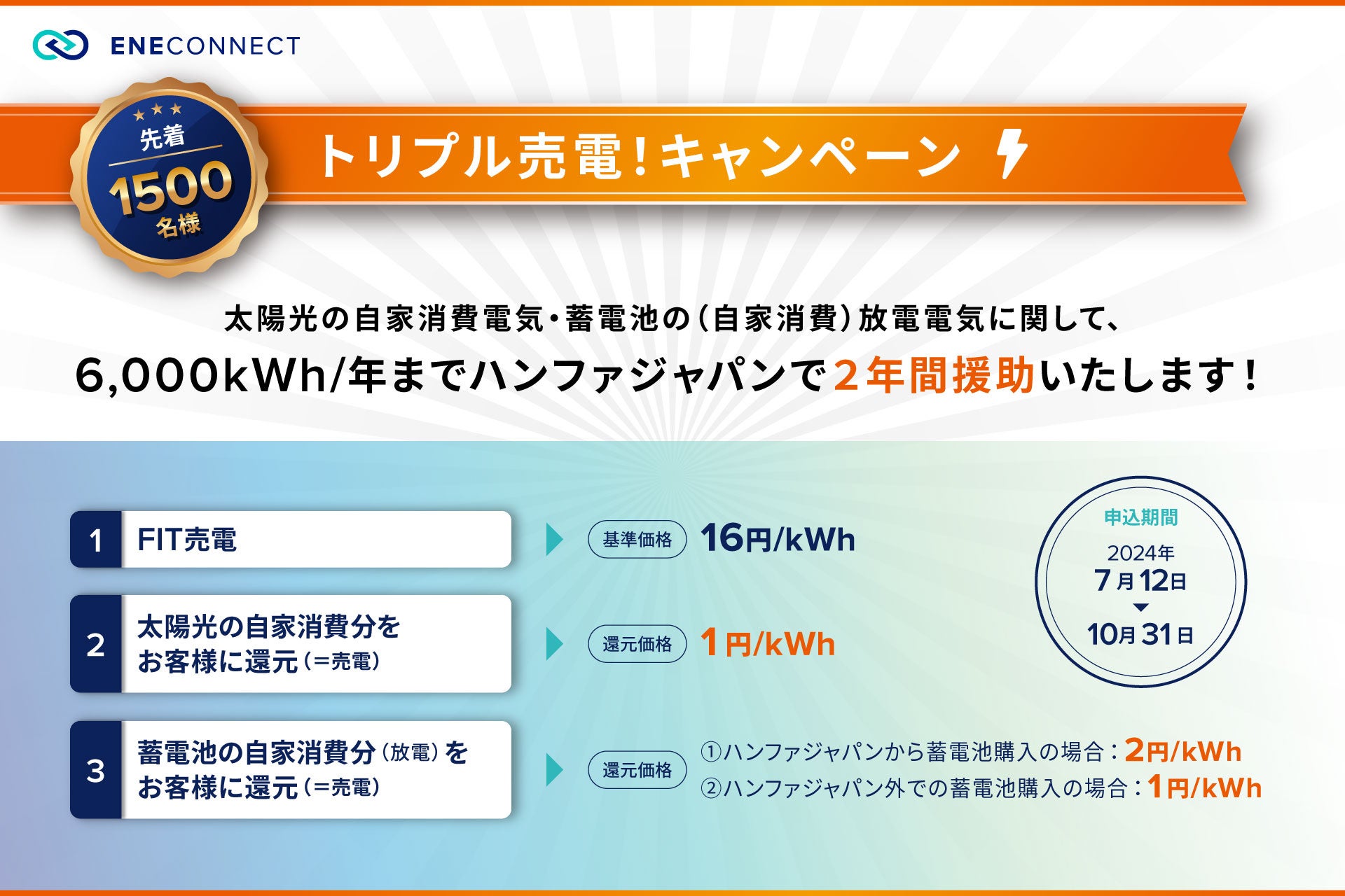 世界トップクラスの太陽光発電のトータルエネルギーソリューションカンパニー「Qセルズ」を展開するハンファジャパン株式会社(所在地:東京都港区 代表取締役:尹 柱 以下、ハンファジャパン)は、太陽光発電システム、および蓄電システムをエネルギー管理プラットフォームアプリ「ENECONNECT(エネコネクト)」を通じてホームゲートウェイ「Cube J」に接続された方を対象に、2024年7月12日(金)~10月31日(木)の期間で「トリプル売電キャンペーン」を実施いたします。