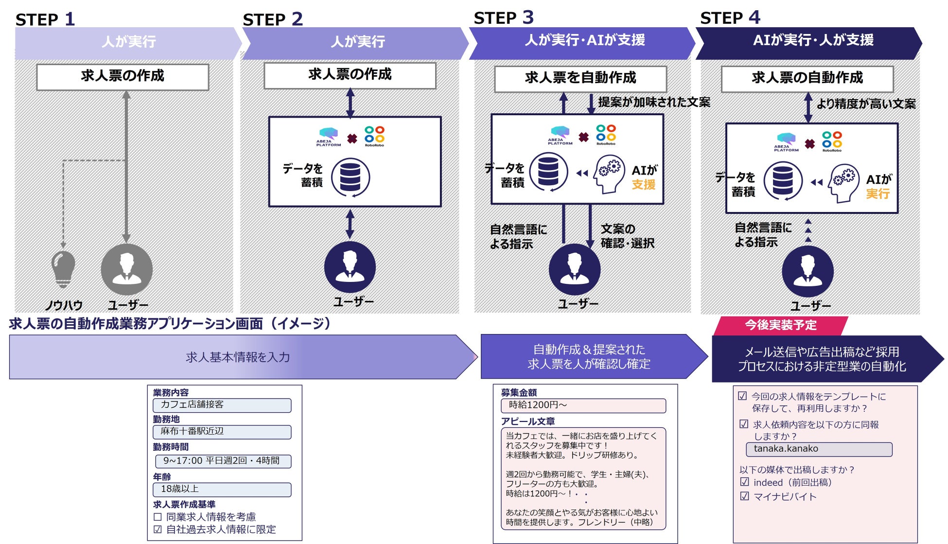 まずは「RoboRobo」が包含する採用業務支援サービス「RoboRobo リクルーティング」とABEJA Platformを連携し、本機能を実装することで、求人票の自動作成を実現いたします。