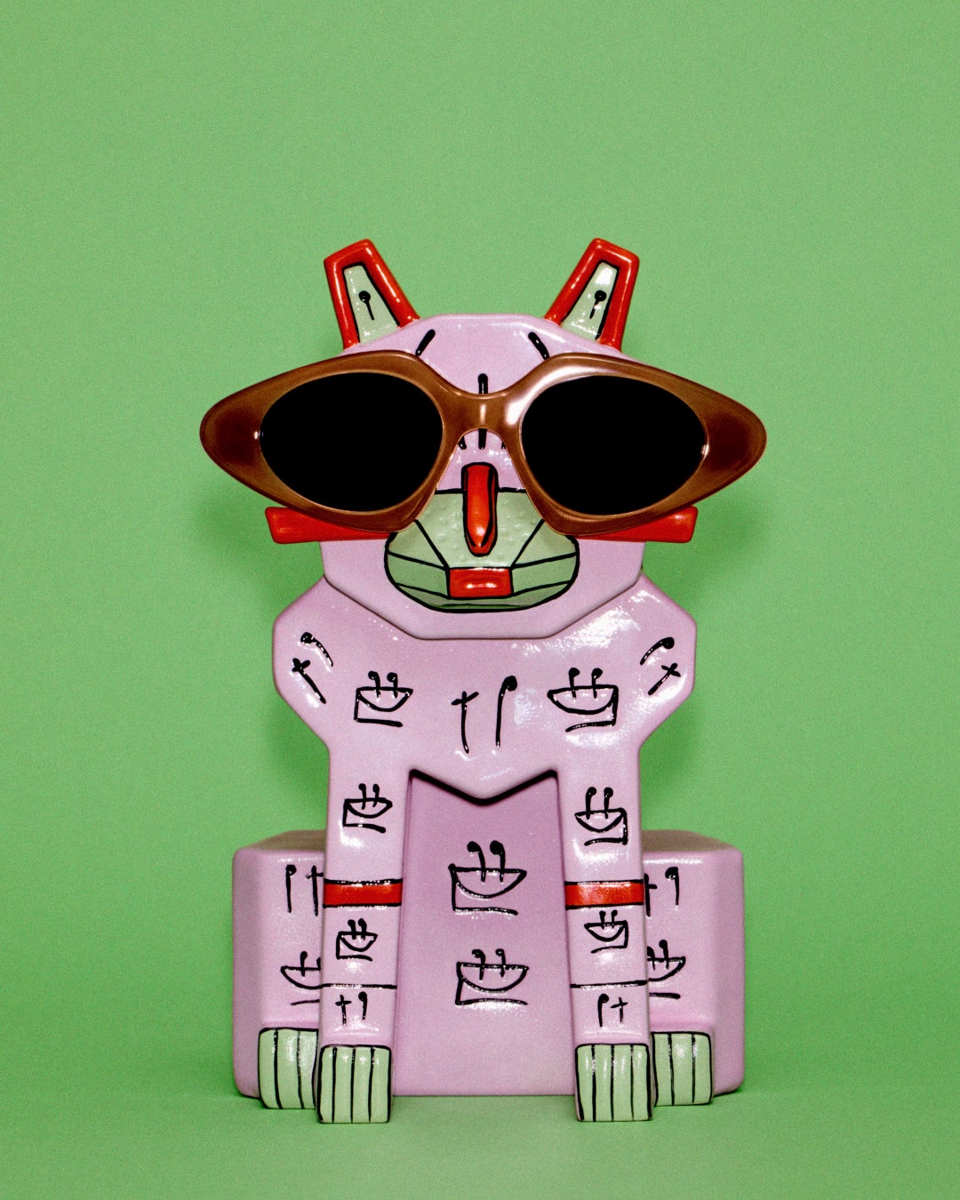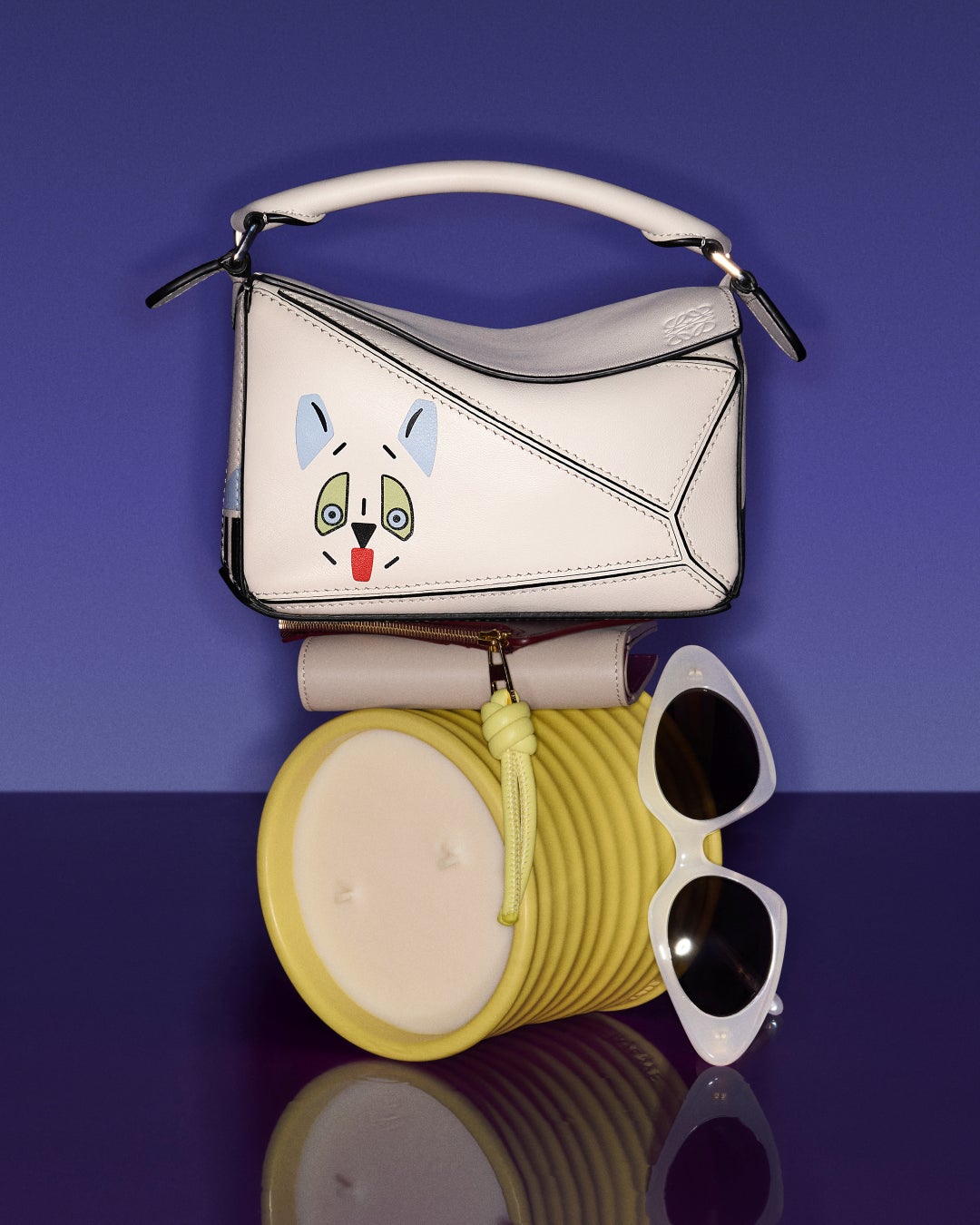 クラフトの現代性、遊び心、そしてアートとの対話が前面に置かれています。これらの要素は、イギリスのアーティスト、ルイス・ウェイン(1860–1939)の作品から着想を得た一連のアイテムに表現されています。ウェインは擬人化された風変わりな猫を描き出したことで知られ、その作品がホリデーコレクションに魔法のような雰囲気をもたらします。彼は20世紀初頭にカルト的な人気を博し、「猫を描いた男」として広く知られる存在となりました。後期の作品では、キュビズムや未来派の影響を受け、自然主義的なイラストから抽象的な表現へと移行します。なかでも注目すべきは磁器の花瓶シリーズ《Futurist Cats(未来派の猫)》で、万華鏡のような色彩と幾何学的なパターンにより、猫の姿を立体的なデザインとして生き生きと表現しています。この独特な世界観が、ウェインのビジョンとロエベの精緻なクラフトマンシップを融合させた、あざやかなホリデーコレクションの着想源となっています。