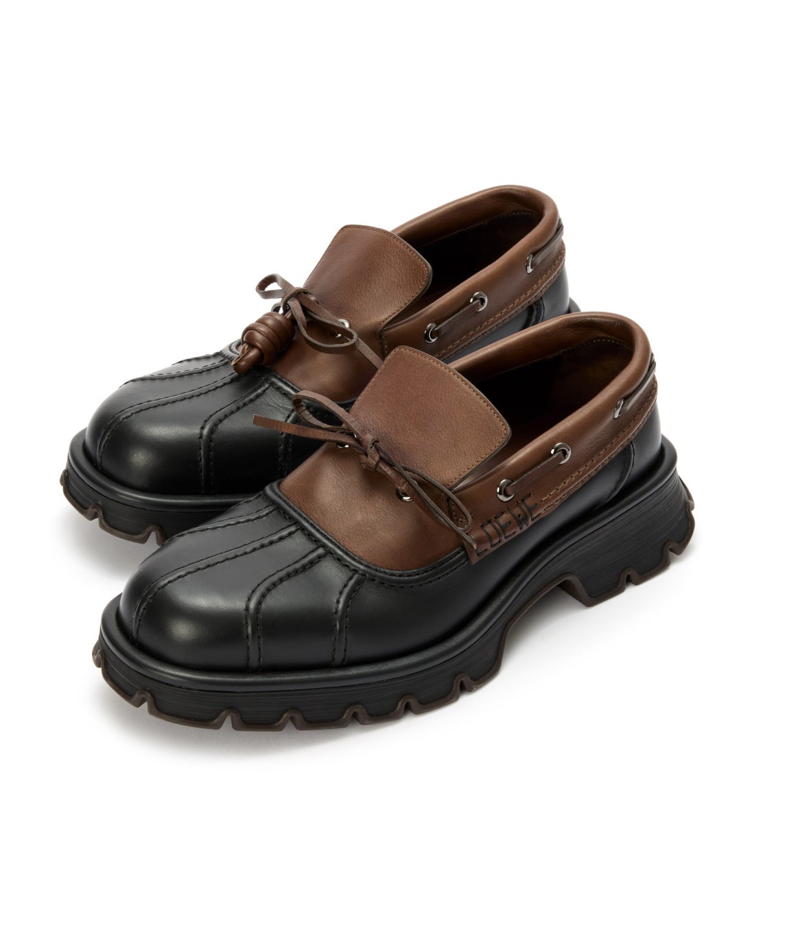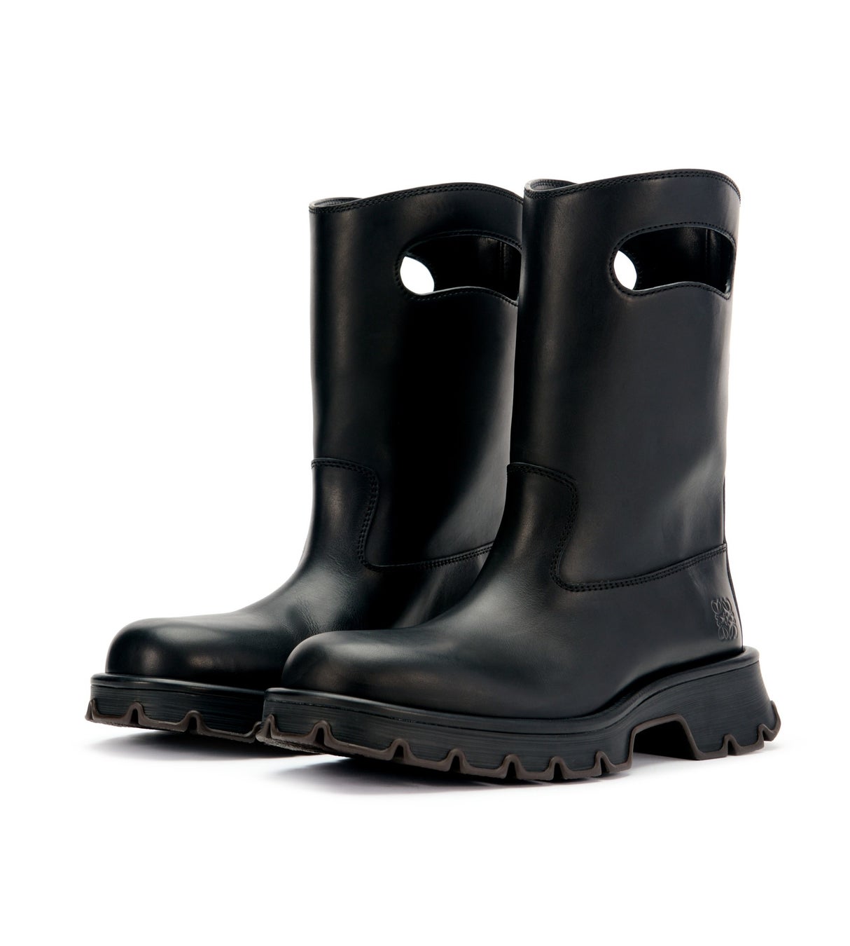ロエベのコードをさらに強調するのがシューズコレクションです。ボビン ブーティ、ペタル アナグラム、そしてフラメンコノットのサンダルやミュールは、彫刻的なアプローチで表現されています。一方、トイ パンプスは光沢感のある素材を用いており、フューチャリスト キャットをかたどったヒールチャームも登場します。メンズラインにも同じ精神が息づいています。パズルをはじめ、新作のループ バケットやループ ホーボーがそれを体現しています。さらに、ボビン ブーツとボビー ハンドル ブーツがメンズコレクションに加わり、ウィメンズラインとの間に新たな対話を生み出しています。
