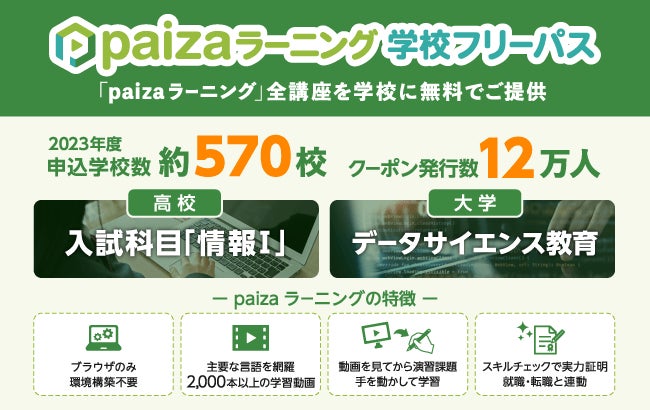ITエンジニア向け国内最大の転職・就職・学習プラットフォーム「paiza(パイザ)」を運営するpaiza株式会社(東京都港区、代表取締役社長/CEO 片山良平)は、当社が提供する「paizaラーニング 学校フリーパス」の2023年度申込学校数が574校、クーポン発行数が12万人を突破しましたのでお知らせします。全国の⼤学、⾼校、専⾨学校を中⼼に利用されている「paizaラーニング 学校フリーパス」の導入校は増加し続けており、その活用範囲はますます拡大しています。