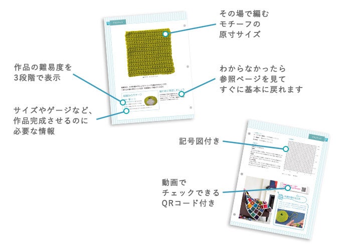 モチーフはやさしい色合いとナチュラルな配色で統一され、暮らしになじむかわいらしいデザインが特長です。さまざまな模様や編み方のバリエーションを楽しみながら、統一感のあるブランケットに仕上がります。