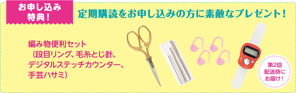 定期購読をお申込みの方全員に、本シリーズの作品づくりに役立つ特別なかぎ針編みアイテムをお届けします。制作の時間をより快適に楽しむことができます。