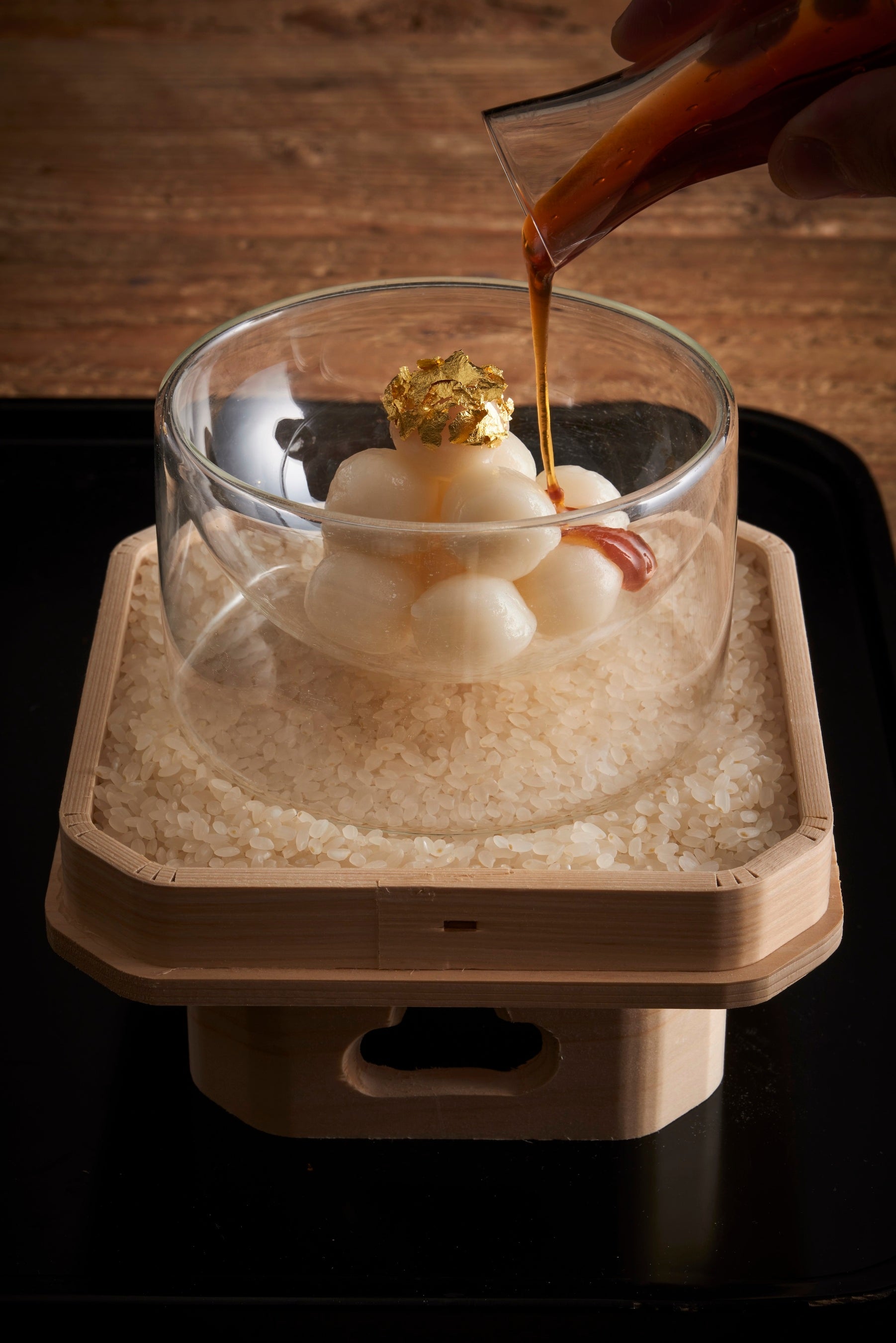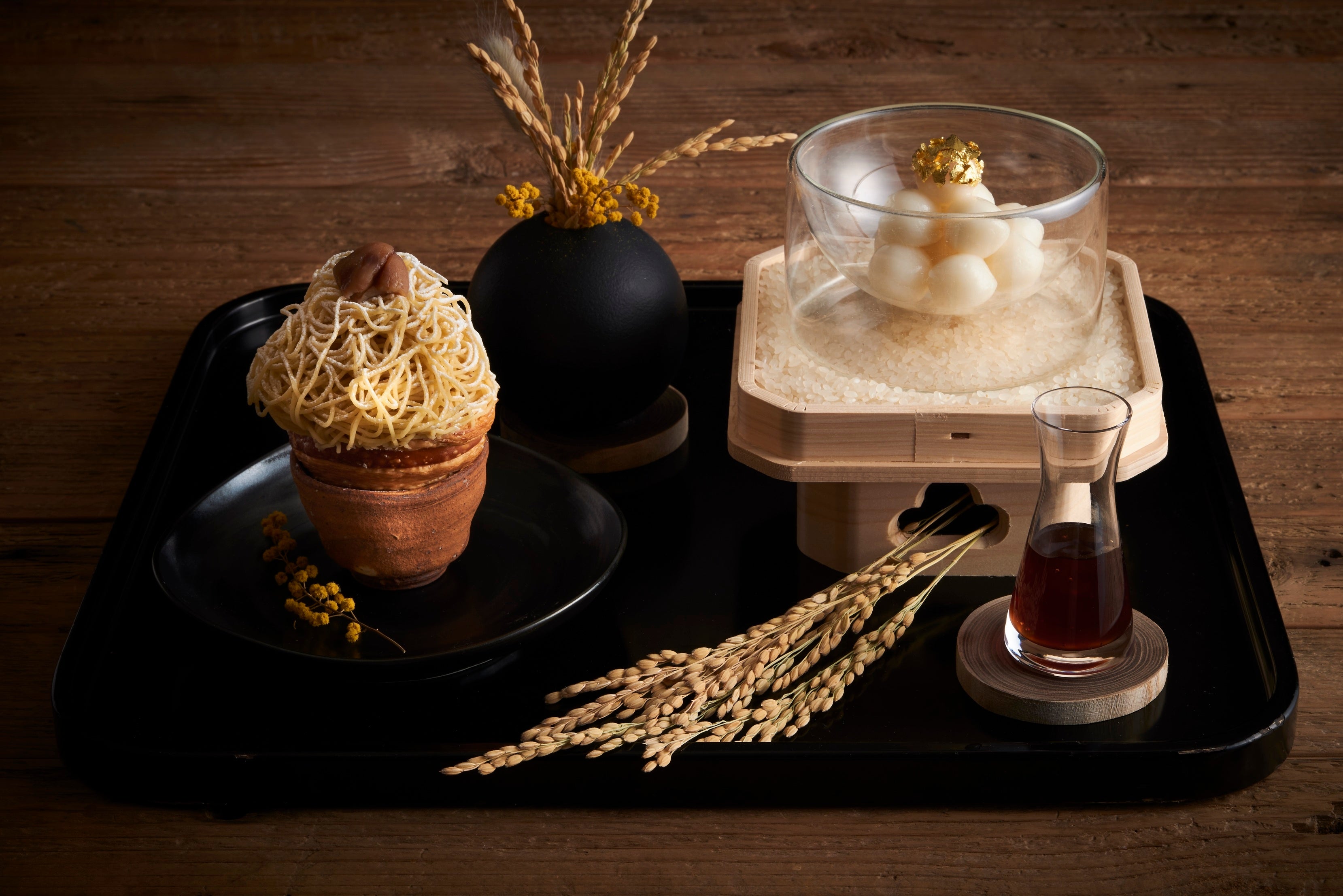 シロップをかけて味わうお団子、和栗のクロワッサンモンブラン、紫芋のクリームをのせたヘーゼルナッツフィナンシェのほか、ウサギに見立てたブリアサヴァランと栗のサンドウィッチ、満月を思わせるポーチドエッグと蕎麦ロールも。日本の伝統をフランス人のエスプリで表現したメニューで、昼下がりのお月見をご堪能ください。