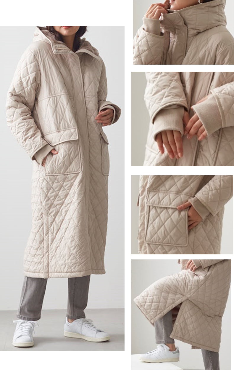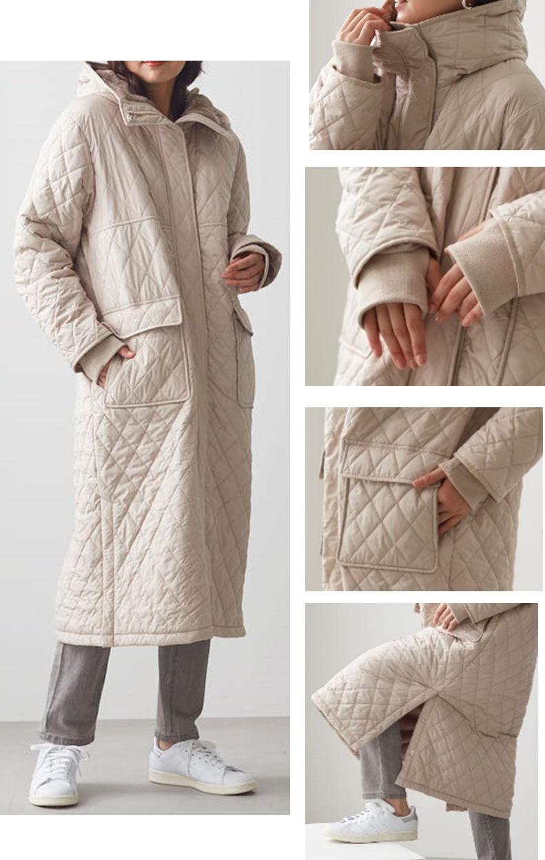 ・表生地と裏地の間に、絶妙な厚みのシート状の中わたを全周にぐるっとはさむことで、保温性をキープ