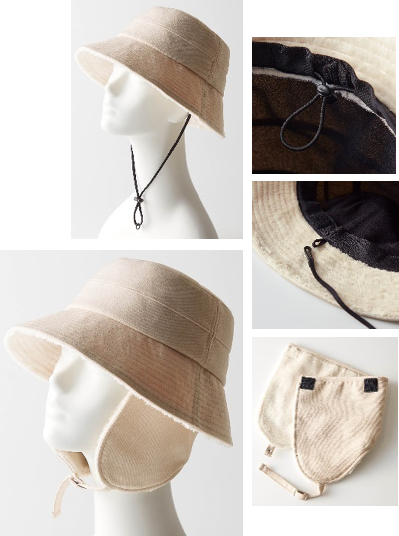 ・防風素材内臓の大きな耳当て付きで、顔周りと首元まであたたかく包みつつ、すっぴんやヘア隠しにも活躍。冬の紫外線対策にも。