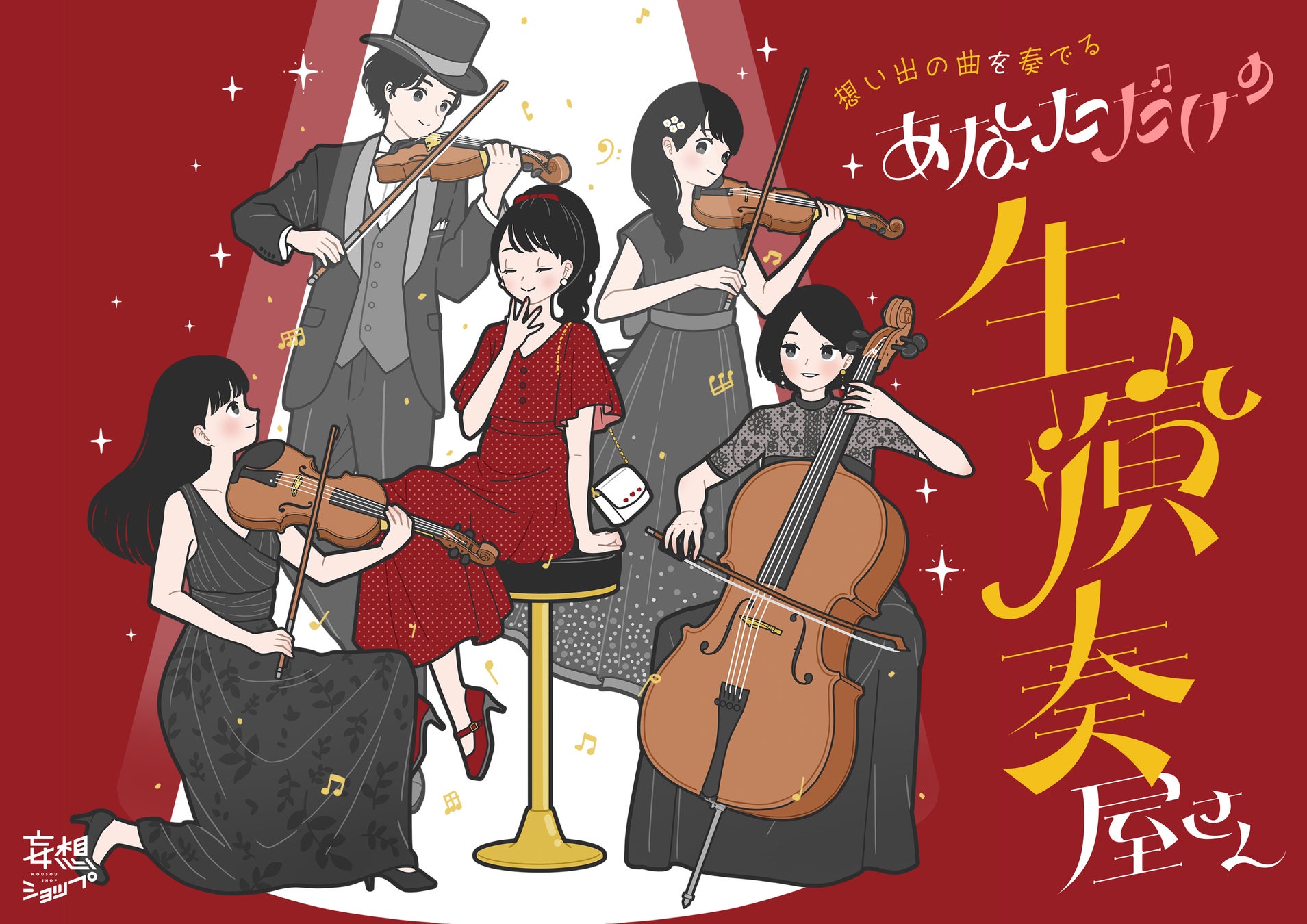 あなたの想い出の曲や大好きな曲を音楽隊(弦楽四重奏:バイオリン×2、ビオラ、チェロ)があなたの為だけに、生演奏してくれるお店です。大好きなあの曲を聴きたい!人生のテーマソングを聴いて元気になりたい!恋人と一緒に想い出の曲を聴きたい!親友の大好きな曲をプレゼントしたい!などなど、事前にリクエストいただいた曲の中から1曲をあなたや大切な人のためだけに生演奏いたします。