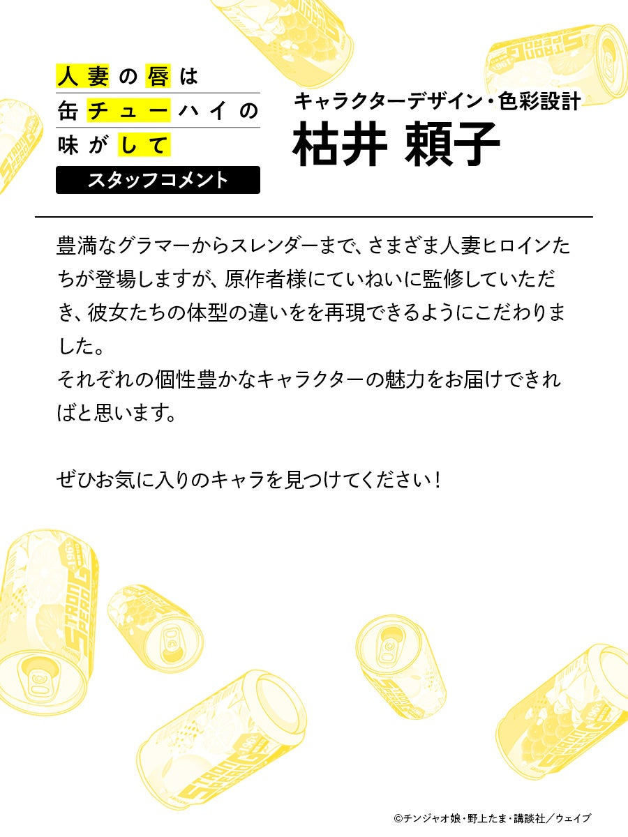コンビニ出てすぐ缶チューハイ開けてあおるツヨシにものすごく好感が持てます。アニメ「人妻の唇は缶チューハイの味がして」では人妻の持つ魅力、ほんの少しの後ろめたさと高揚感、あとお酒の勢いを大事にしたつもりです。いろんな味わいの彼女達とのワンナイト、ドキドキを味わってください!