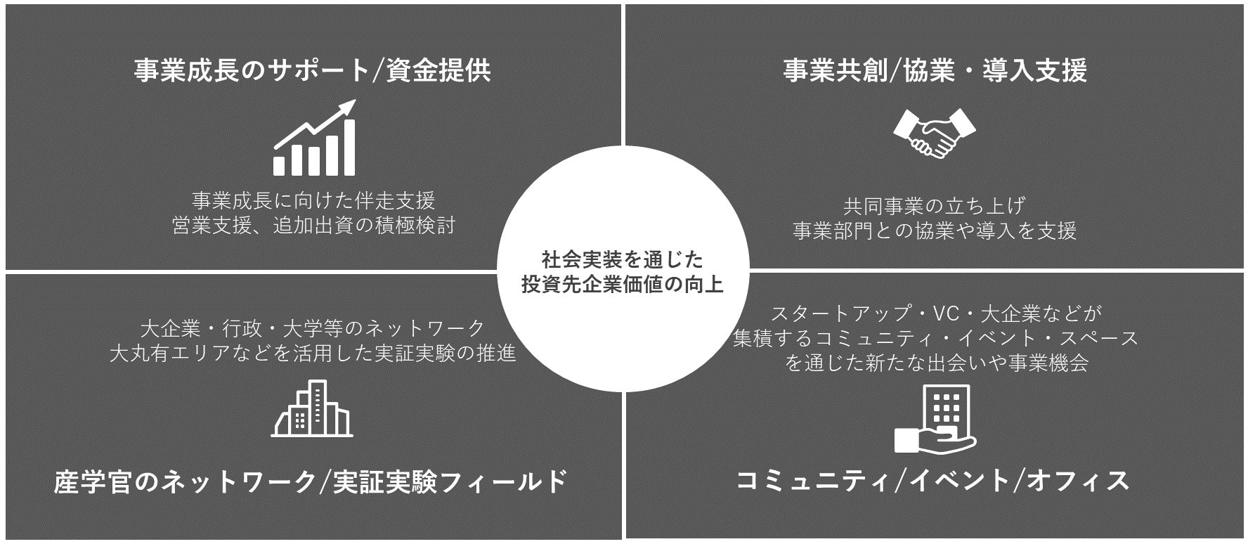 三菱地所グループの持つネットワークを活用した営業支援、事業共創、大丸有エリアを活用した実証実験の推進など社会実装を通じた投資先企業価値の向上を図ります。