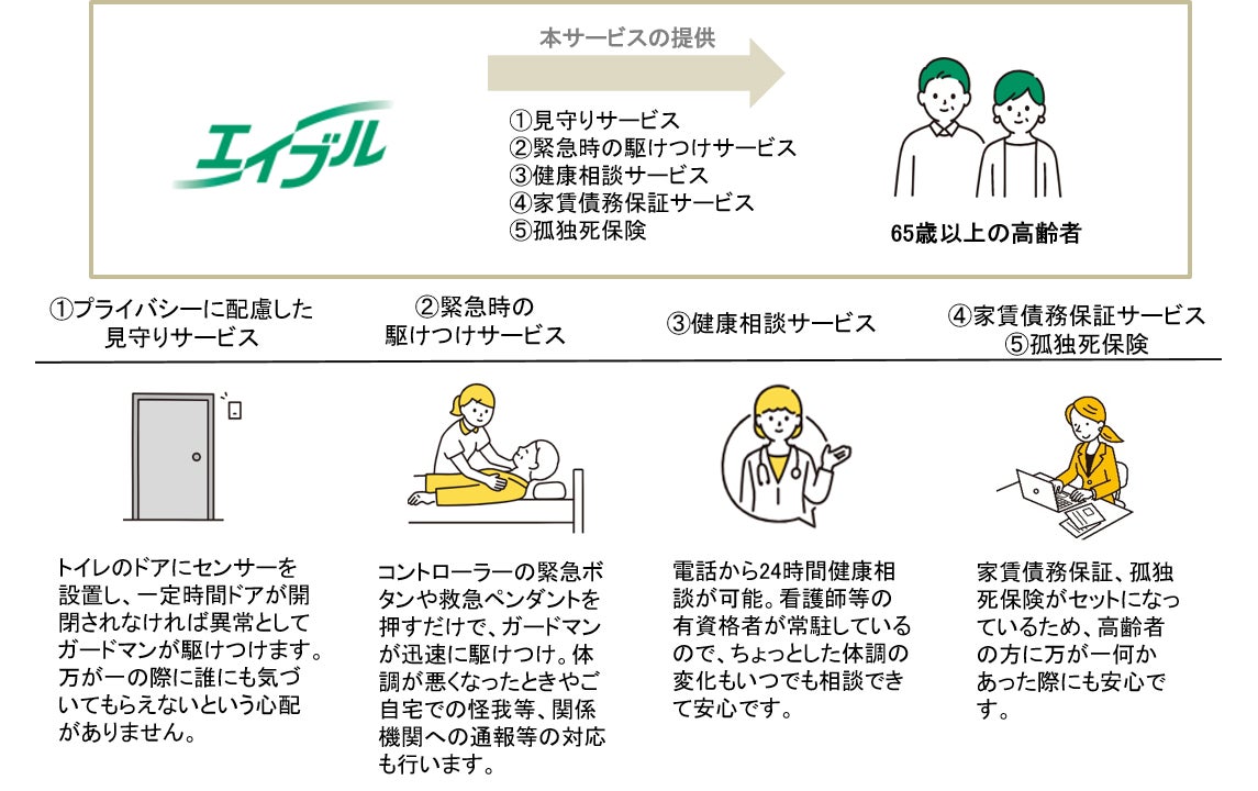 東海エリア直営33店舗で2024年11月7日以降にエイブルの管理物件でご契約いただいた方(※2)が対象となり、綜合警備保障株式会社(本社:東京都港区)が提供する安否確認センサーの設置やいざという時に通報できる緊急ボタンが付いたコントローラーや救急ペンダントのお渡し、看護師資格等を持つスタッフとの24時間健康相談ができるサービスに加え、株式会社エポスカード(本社:東京都中野区)が提供する家賃債務保証サービスを使用しており、エポスカードをお持ちの方またはカード発行された方は毎月の保証料が無料となります。