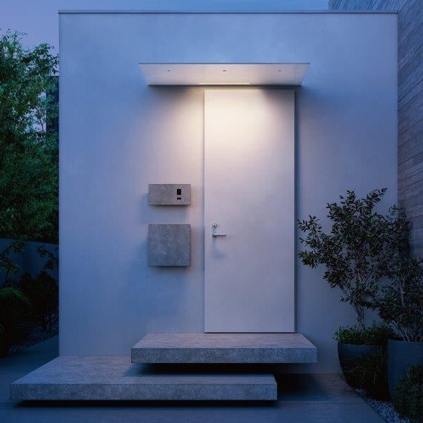 シンプルモダンなデザインとワイドな幅が人気の玄関庇です。一見、照明付きとは分からないほど庇と一体化したスリットライトが特長です。夜間の安心感を高め、外観を美しく彩ります。