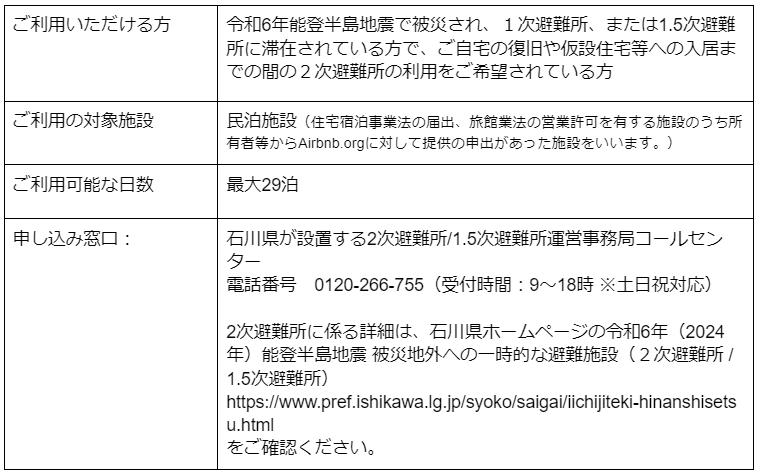 Airbnb.orgを通じた能登半島地震への支援に関して、現在、Airbnb.orgでは、石川県内に所在する民泊施設のみ(また、住宅宿泊事業法の届出済又は旅館業法の許可を取得済の施設に限ります)を対象としており、県外の施設は対象となっておりません。また、上記に記載された「お申し込み窓口」のみを通じて予約支援を行っております。したがって、Airbnbのコールセンターでは施設提供の申出及び予約相談を承っておりません。予めご了承ください。
