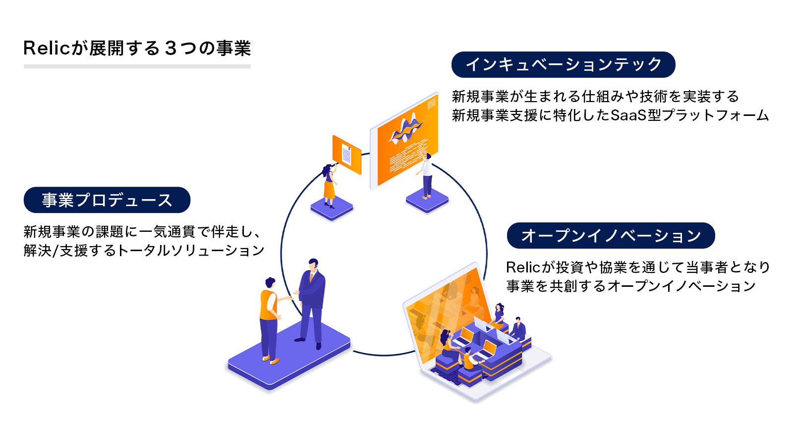Relicは日本企業の新規事業開発やイノベーション創出を支援する「事業共創カンパニー」として、 世界でも類を見ない新規事業開発に特化したSaaS型プラットフォームを提供する「インキュベーションテック事業」、 総合的かつ一気通貫で新規事業やイノベーション創出を支援する「事業プロデュース/新規事業開発支援事業」、 スタートアップ企業への投資や大企業との共同事業/JVなどを通じてイノベーションを共創する「オープンイノベーション事業」という3つの柱となる事業を統合的に展開してまいりました。