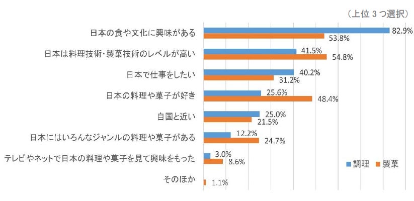 留学先に日本を選んだ理由として、料理・菓子を学ぶ学生の間で、例年同じように志向の違いが出るのは興味深い結果です。決め手となった上位3つは両者とも日本の食や文化への興味と技術力の高さで、日本で学んだ先に、日本での就職を見据えているようです。また、菓子を学ぶ学生においては日本の菓子が好きで多様な種類があることも魅力になっているようです。